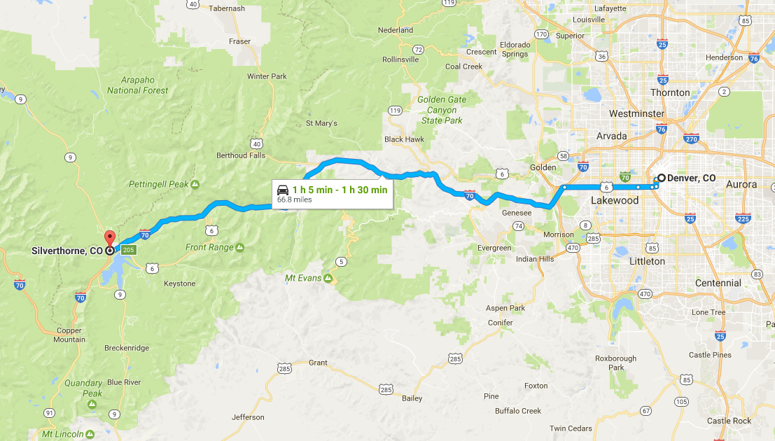 The worst time to leave Silverthorne when driving back to Denver on a Sunday is between 2 and 6 p.m., with a peak drive time of 2 hours and 30 minutes as opposed to 1 hour and 15 minutes without traffic.
