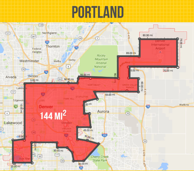 9. Portland, Oregon If Denver were as dense as L.A., it would take up 80 square miles, or about half of its size. sparefoot.com