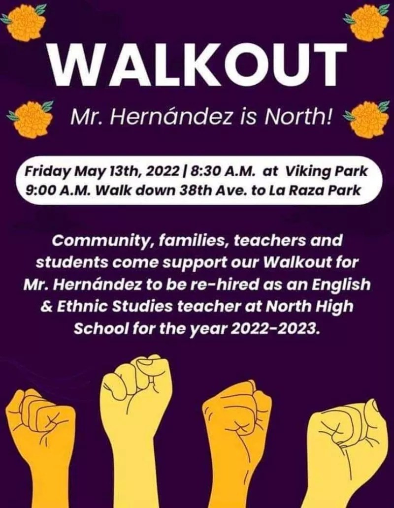 At 8:30 a.m. today, May 13, a student walkout is planned at North High School to protest the decision not to retain teacher Tim Hernández – a decision he feels has everything to do with his belief in speaking truth to power.