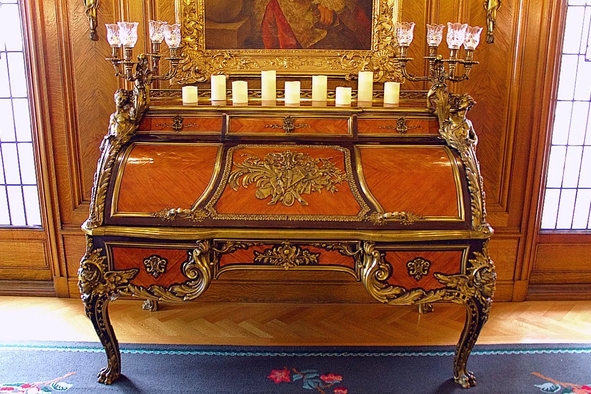 Also in the library is a Louis XIV French cylinder desk made by one of the king’s own furniture makers, one of just a few left in the world, says Carol, a tour guide for seven years. “It’s very unusual, very rare.”