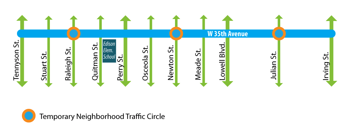 If Conklin’s story sounds melodramatic, he’s actually just one local among many who are not pleased – to put it mildly – about the traffic circles that the City of Denver installed along 35th at Raleigh, Newton and Julian streets this summer. Like Conklin, those neighbors are questioning why the city created traffic circles  rather than just putting in more four-way stops, which are already common throughout the area.