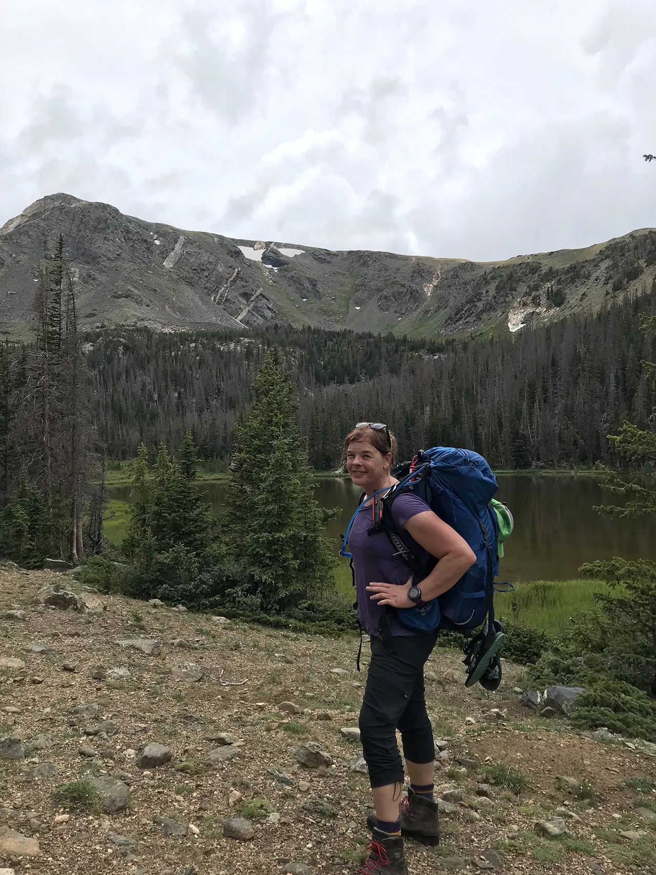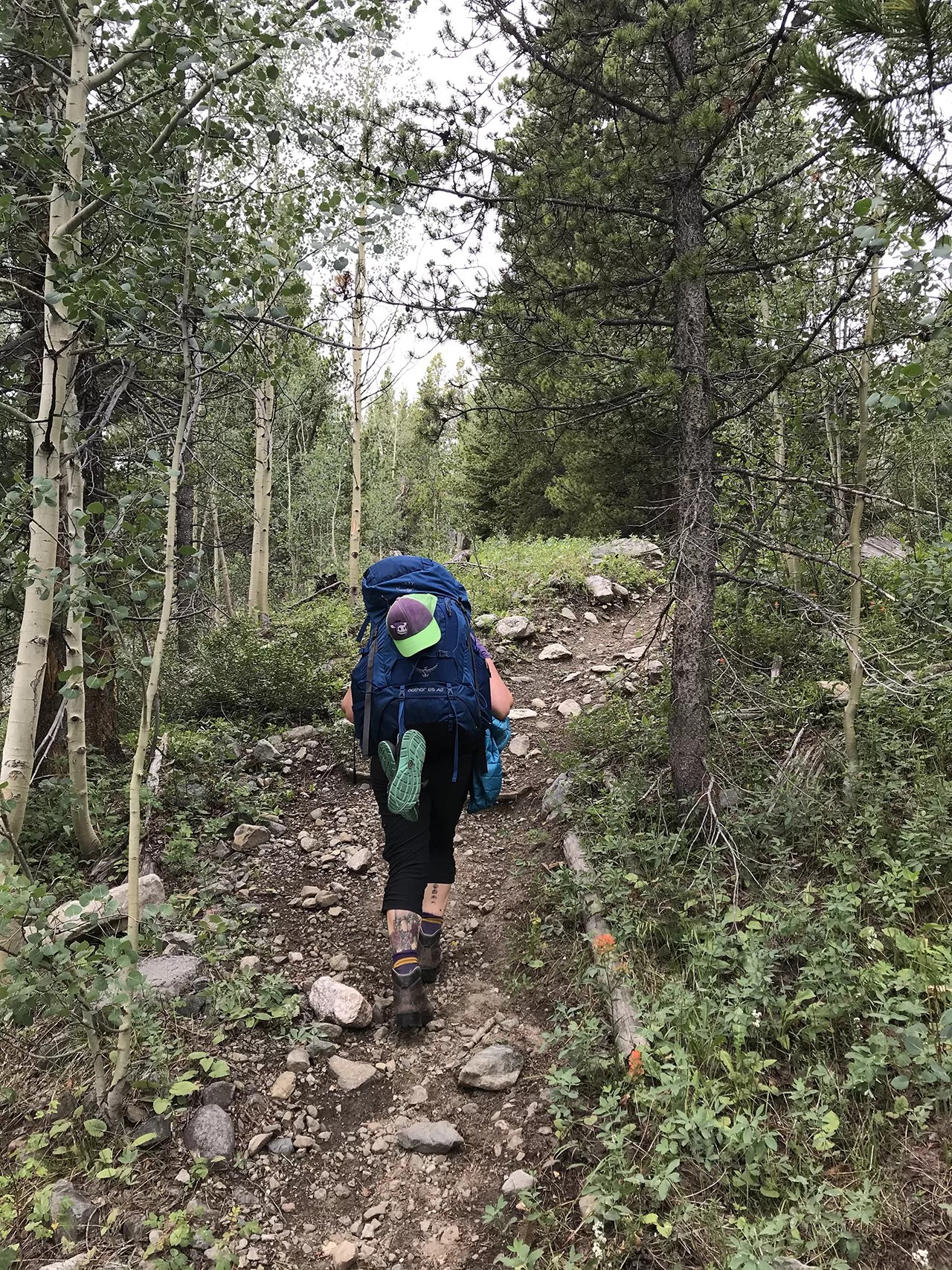 Parisi sets a steady pace up the trail to Pass Creek Lake, which is nestled in the mountains of the San Isabel National Forest near Salida. A neon-green Sweet Cow baseball cap is strapped atop her 85-liter Osprey pack. Despite the trail’s steep grade, she refuses to set down her pack and pauses only briefly to catch her breath.
