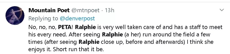 Shortly after this honor went public, the university announced that the latest mascot, Ralphie V, would be retiring – not for any medical reason (she’s said to be in “great health”), but because she’s so damned fast that her handlers can’t keep up with her. PETA apparently interpreted this explanation as evidence that she “can no longer be controlled,” and in a release suggested that CU “retire its live-mascot program along with her in recognition that animals should not be thought of as toys, props or amusements. Instead, they should be respected for who they are and how they live naturally.”