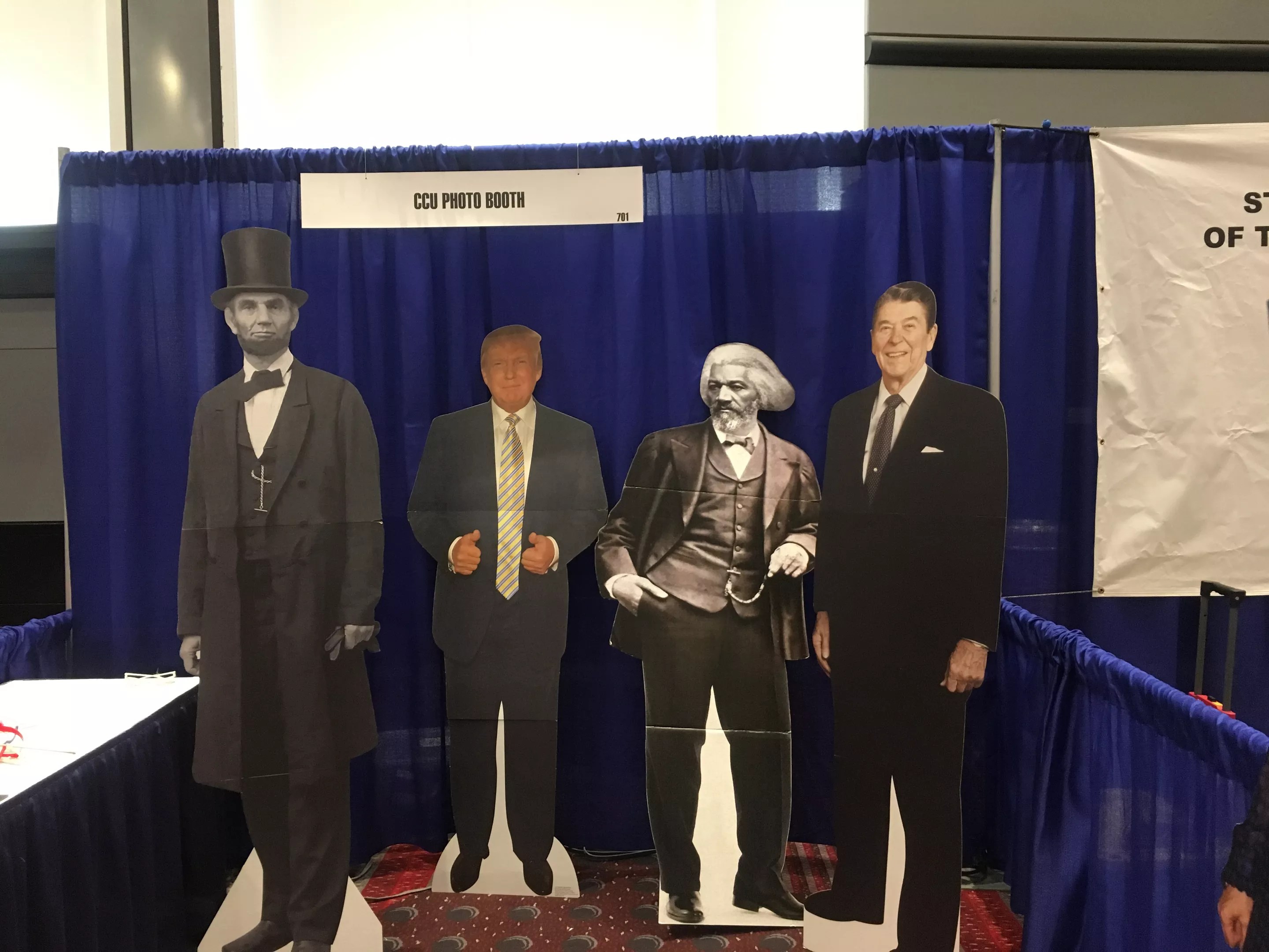 As educational as the main lecture hall is, perhaps more telling is the Exhibit Hall next door, where you’ll find not only your favorite conservative think tanks and organizations (Heartland Institute, Turning Point USA, The Heritage Foundation), but some groups you probably haven’t heard of and later might wish you hadn’t. Some notable mentions: two men with “Global Connection International,” a group that tries to stop human trafficking in the U.S. by driving a bus to school districts in rural Colorado warning teenagers about the dangers of the Internet; a husband-and-wife duo selling material on “Destroying the Shadow Agenda,” which is the spread of evil in the U.S.; the Blazing Holy Fire Ministries, which was passing out business cards encouraging people to pray for President Trump. “He gets attacked so much, and Jesus tells us to pray for our leaders,” the booth tender said.