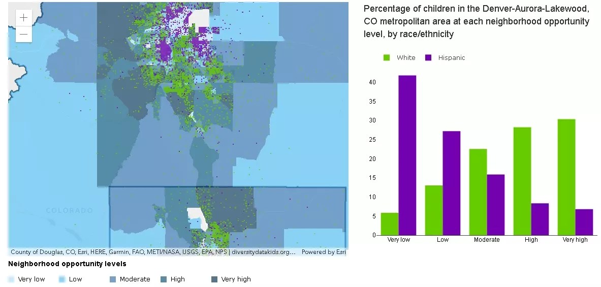 “Like most areas in the country, Denver has a very unequal distribution of kids by race across the five opportunity levels,” she allows. “And when you see that only about 5 percent of white kids live in very lower opportunity neighborhoods, but 40 percent of Hispanic kids do, you can see that we need to do better.”