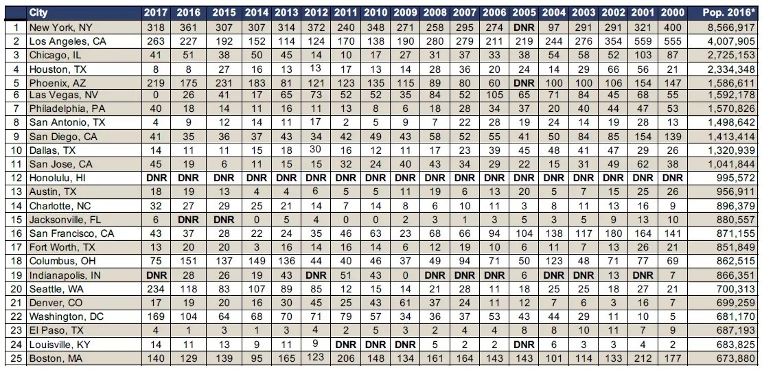 This graphic shows the number of hate crimes recorded in the 25 largest American cities, including Denver, from 2000 to 2017.