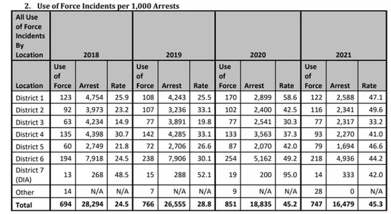According to the Denver Police Department, arrest totals for every district except the one encompassing Denver International Airport have fallen, often by thousands a year, from 2018 to 2021.