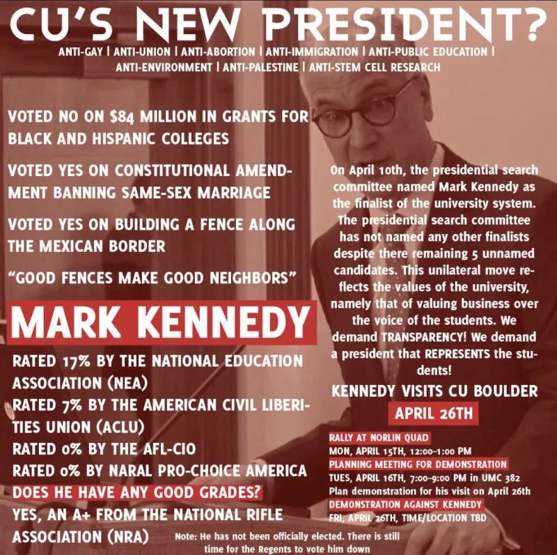 Today at noon on the University of Colorado Boulder campus, a rally will protest the Board of Regents’ choice of Mark Kennedy to become the next president of the four-campus CU system. The event (details below) should be the showiest display of displeasure after the Board of Regents unanimously named Kennedy, a onetime businessman and former Republican member of Congress who has served as the University of North Dakota’s president during the past two years, as the sole finalist for the position.