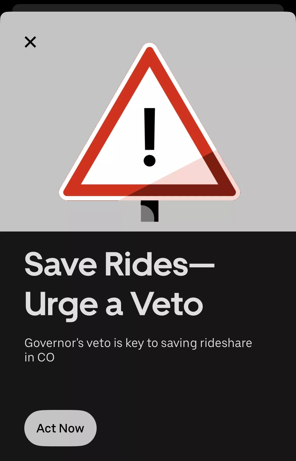 Uber has added multiple pop-up messages to its app directing Colorado customers to ask their legislators and the governor to oppose House Bill 25-1291.
