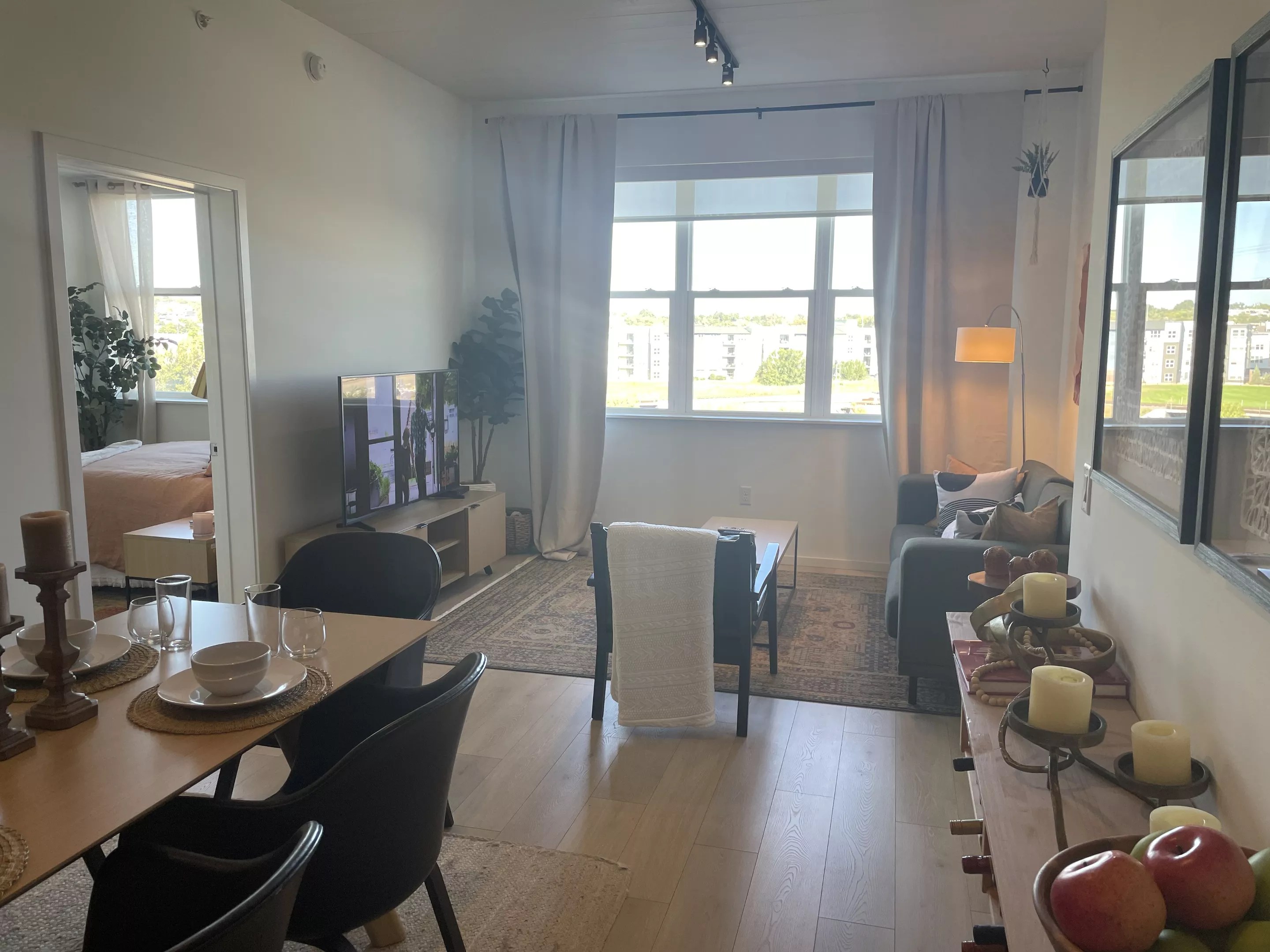 Furnished units come with the basics, including a television, a TV stand, a sofa, dining table and chairs, a bed frame, a mattress and a nightstand.