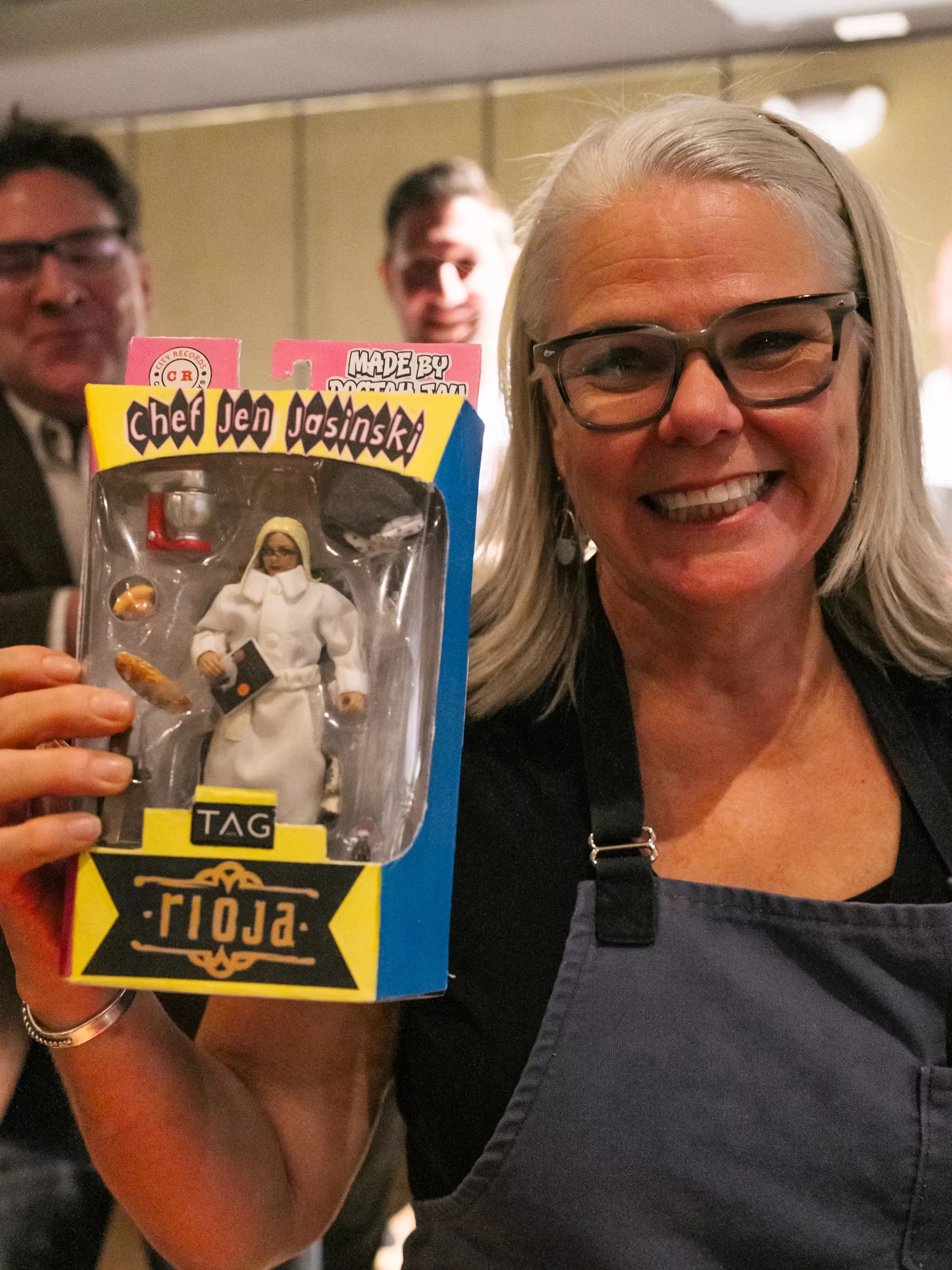 But the party wasn’t over yet. On November 13, Rioja held a sold-out celebration – and then some – that highlighted all the chefs, winemakers and beverage people who’d essentially grown up with Rioja. Some had worked there, others had worked on their own places at the same time. Among these other local heroes were chefs Carrie Baird, Dana Rodriguez, Hosea Rosenberg and Troy Guard – who gave Jasinski an action figure of herself.