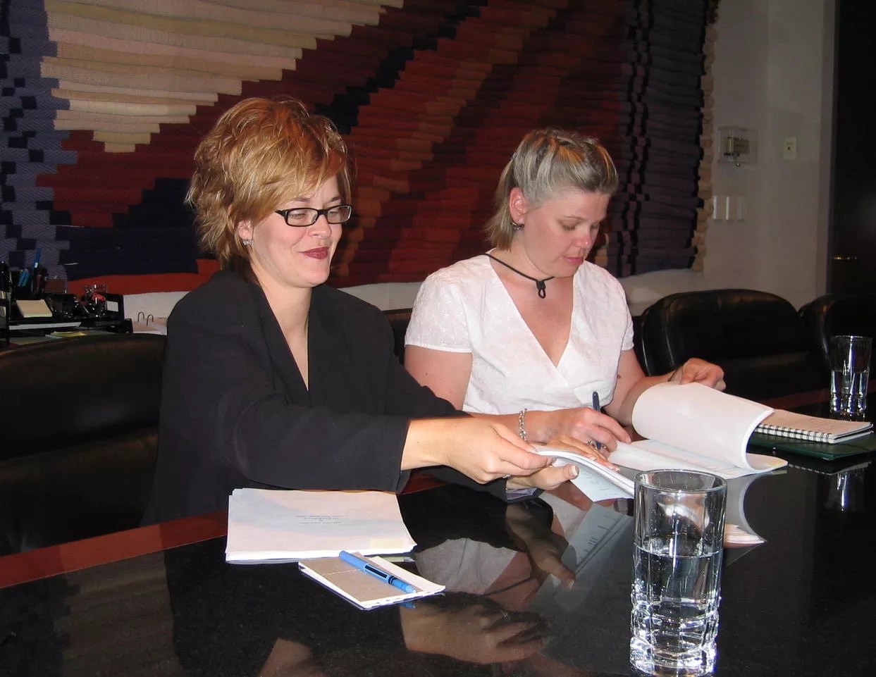 Beth Gruitch and Jen Jasinski sign the lease for Rioja in Larimer Square.