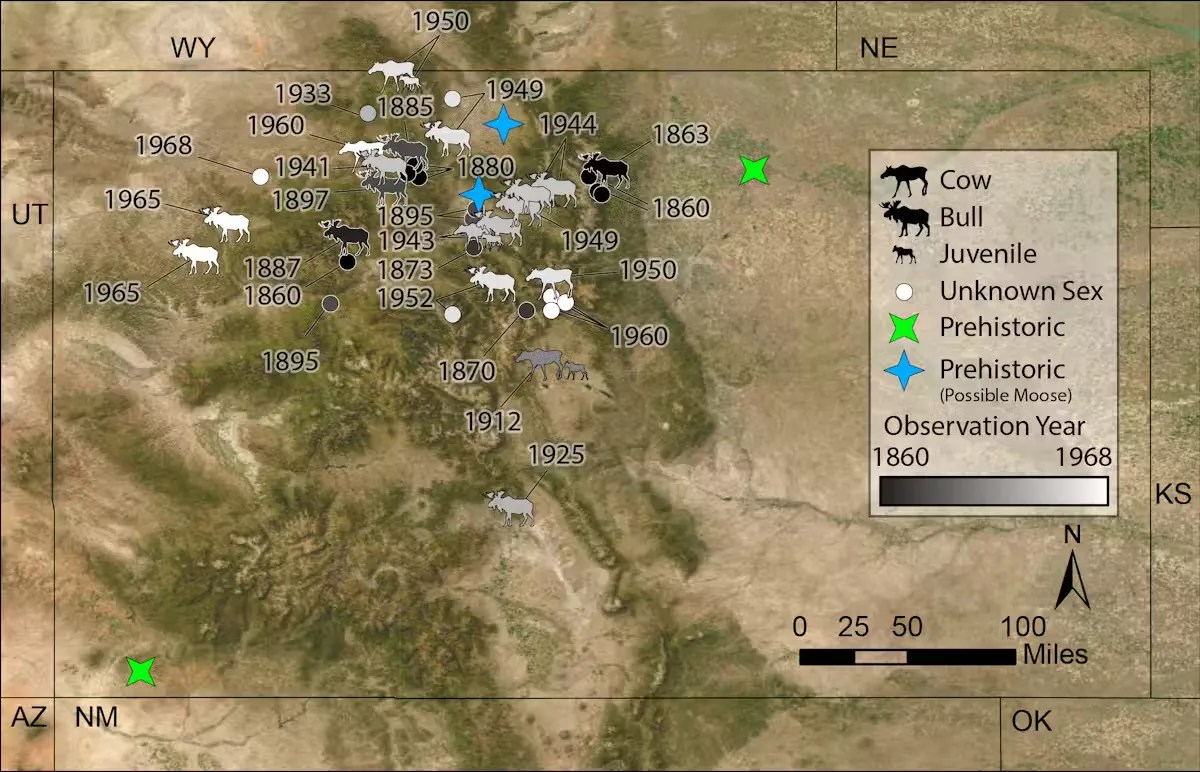 Geographic distribution of moose observations in Colorado from historical sources dated between 1860 and 1970 and published archaeological identification. Isaac Hart/Taylor et al. in review