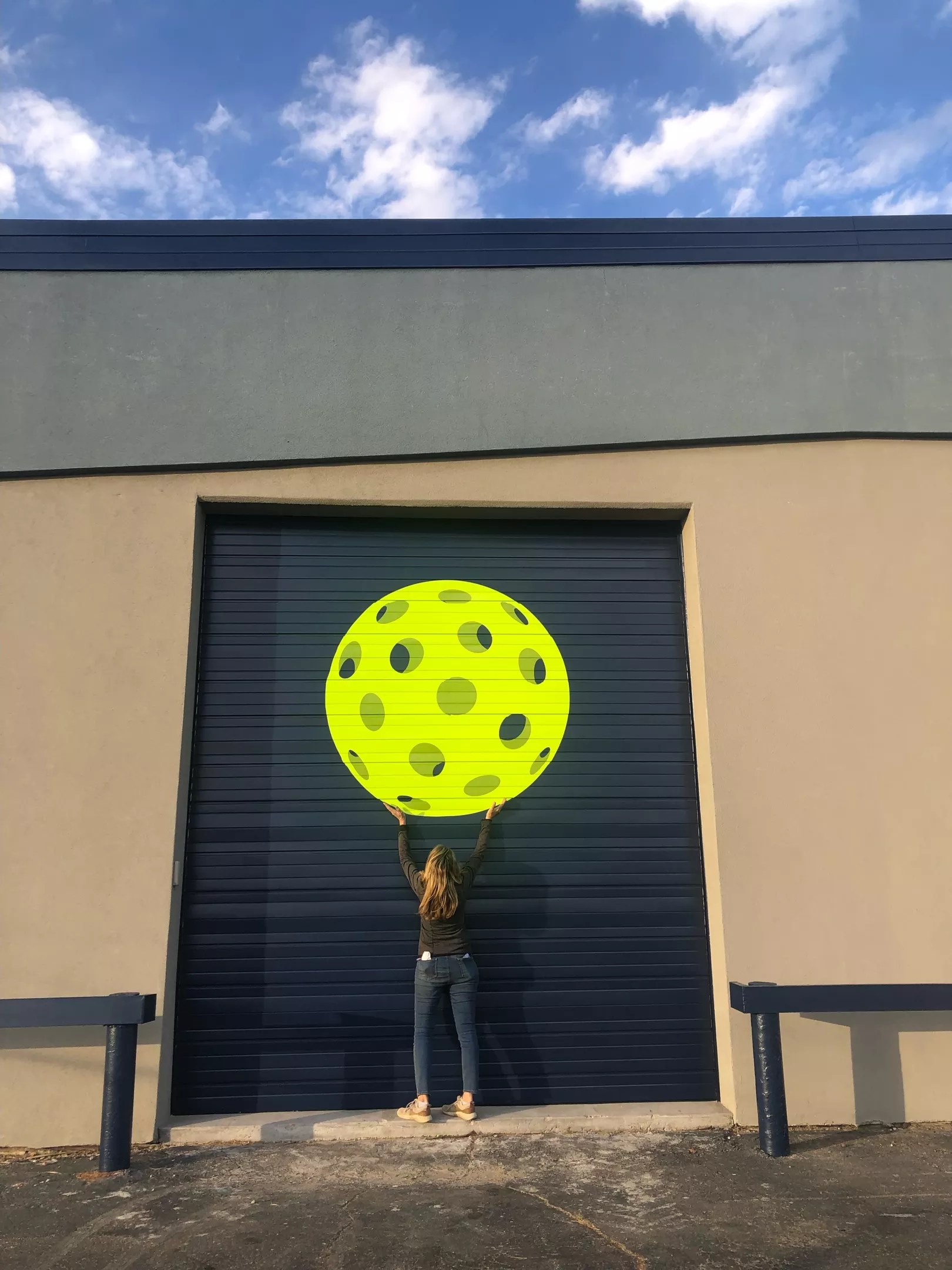 There’s a six-foot-diameter pickleball on each garage door that’s already attracting curious customers.