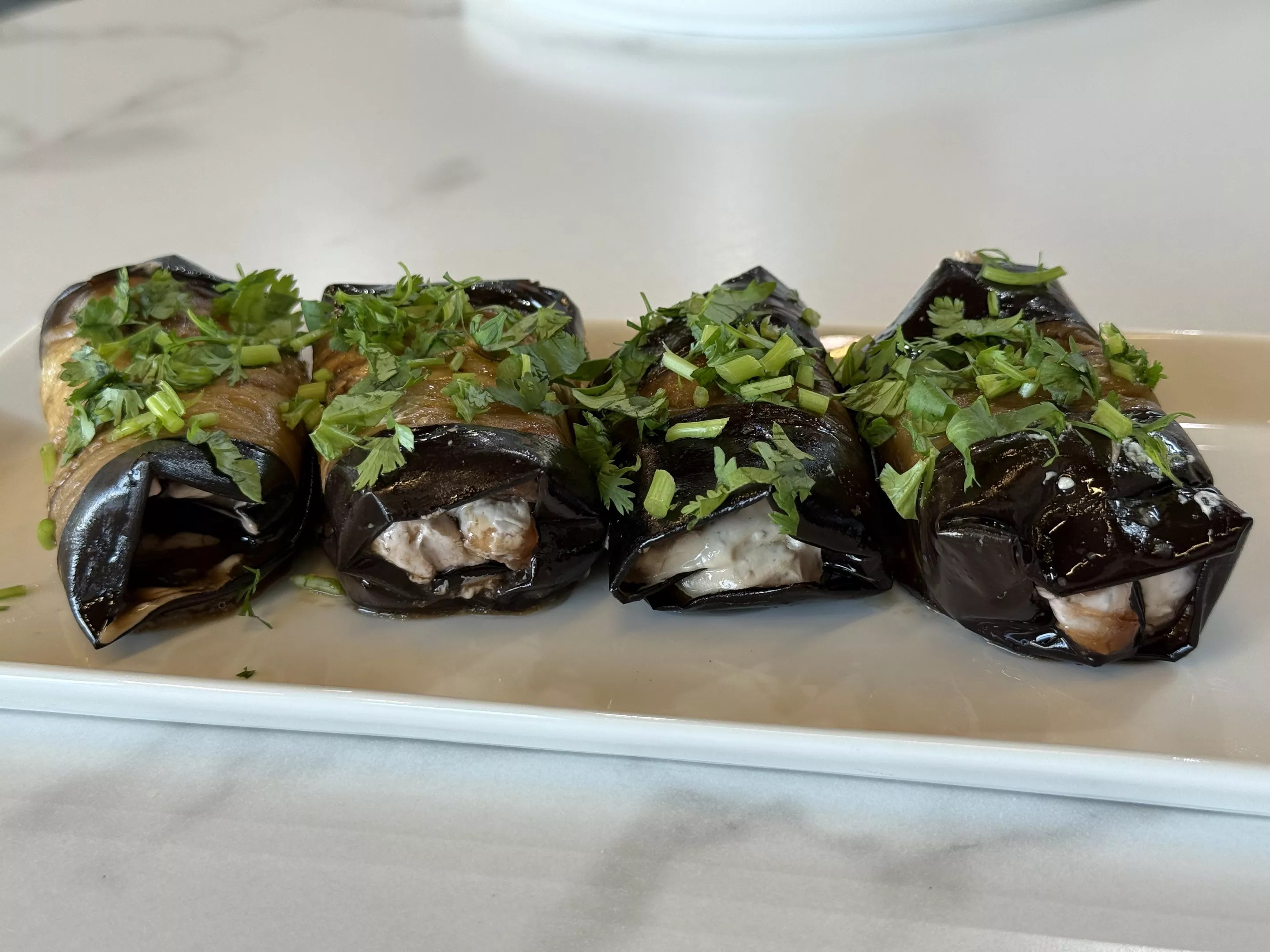 Eggplant rolls served at room temp with a yogurt and walnut filling.