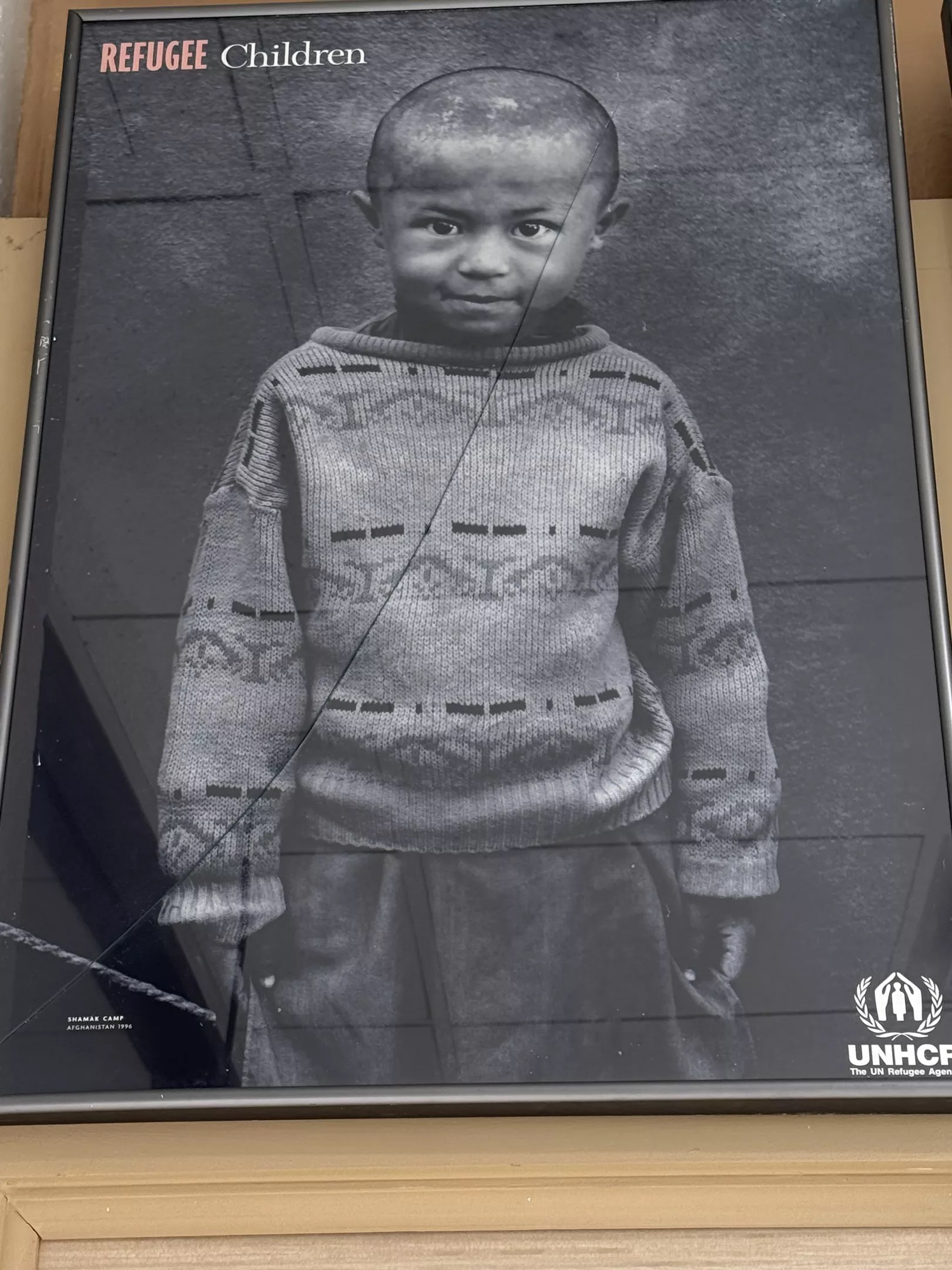 Azimi as a small child, featured in a UNHCR poster highlighting the plight of child refugees.
