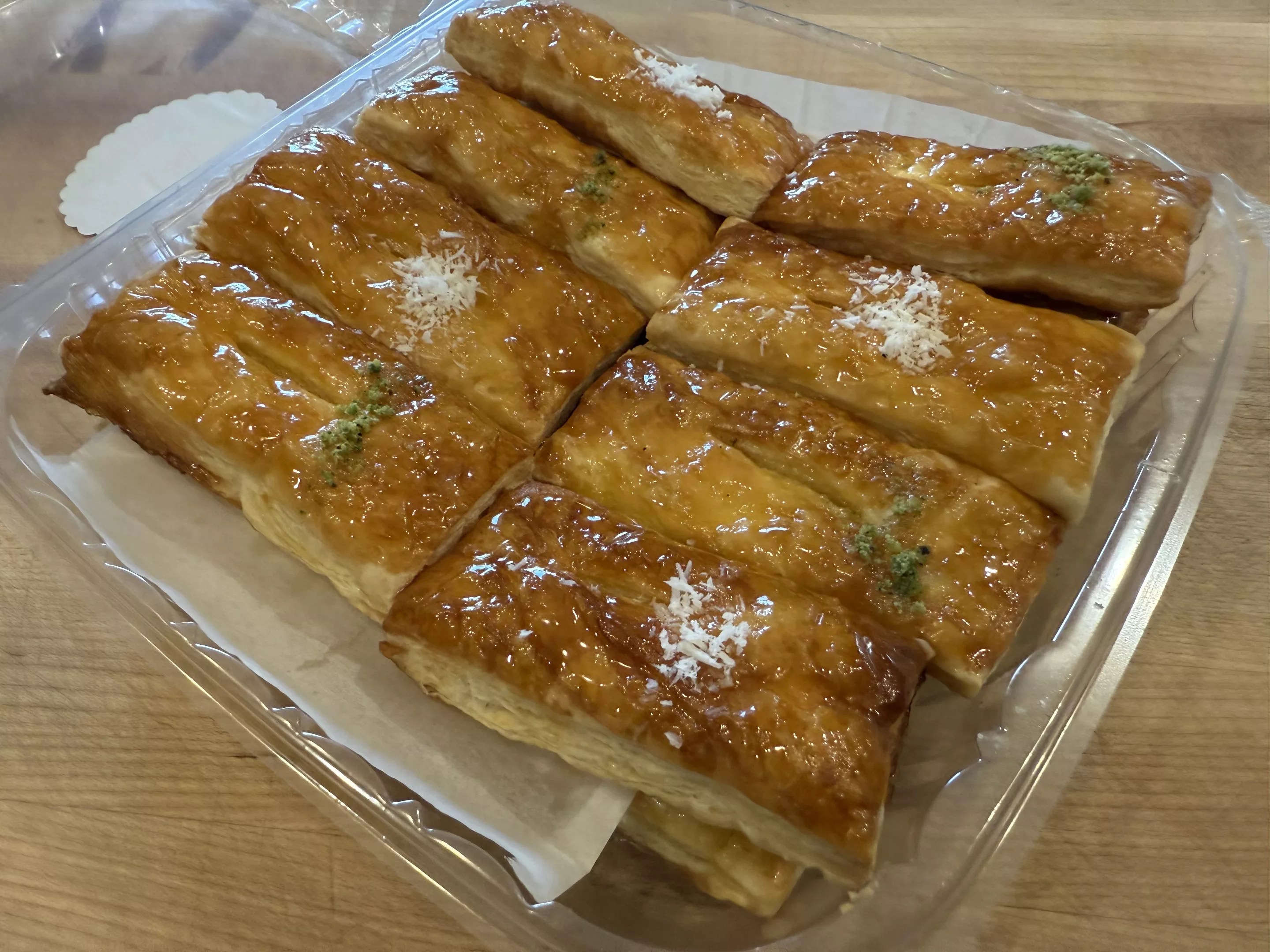 Zaban cookies are strips of puff pastry sweetened with honey and coconut.