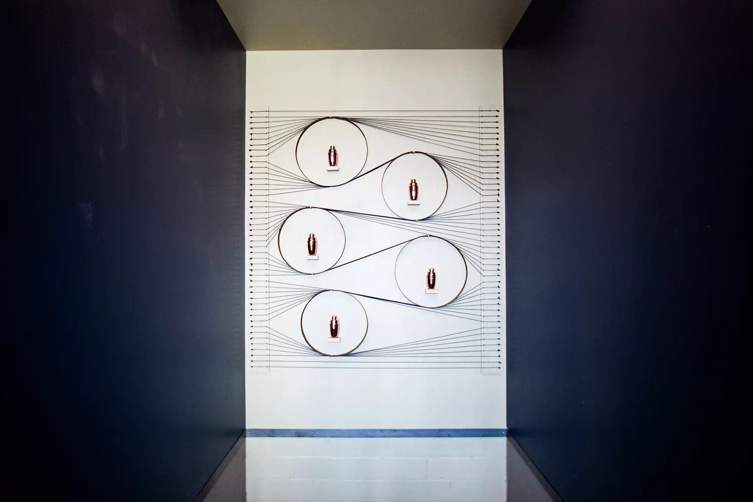 Barrel hoops frame copper cocktail shakers on American Bonded’s back staircase.