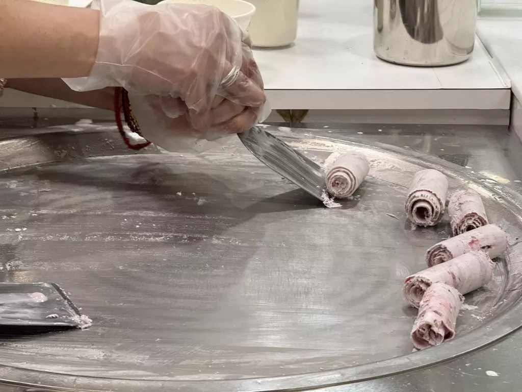 First, the ice cream is quickly spread across a frozen metal plate to set up before rolling.