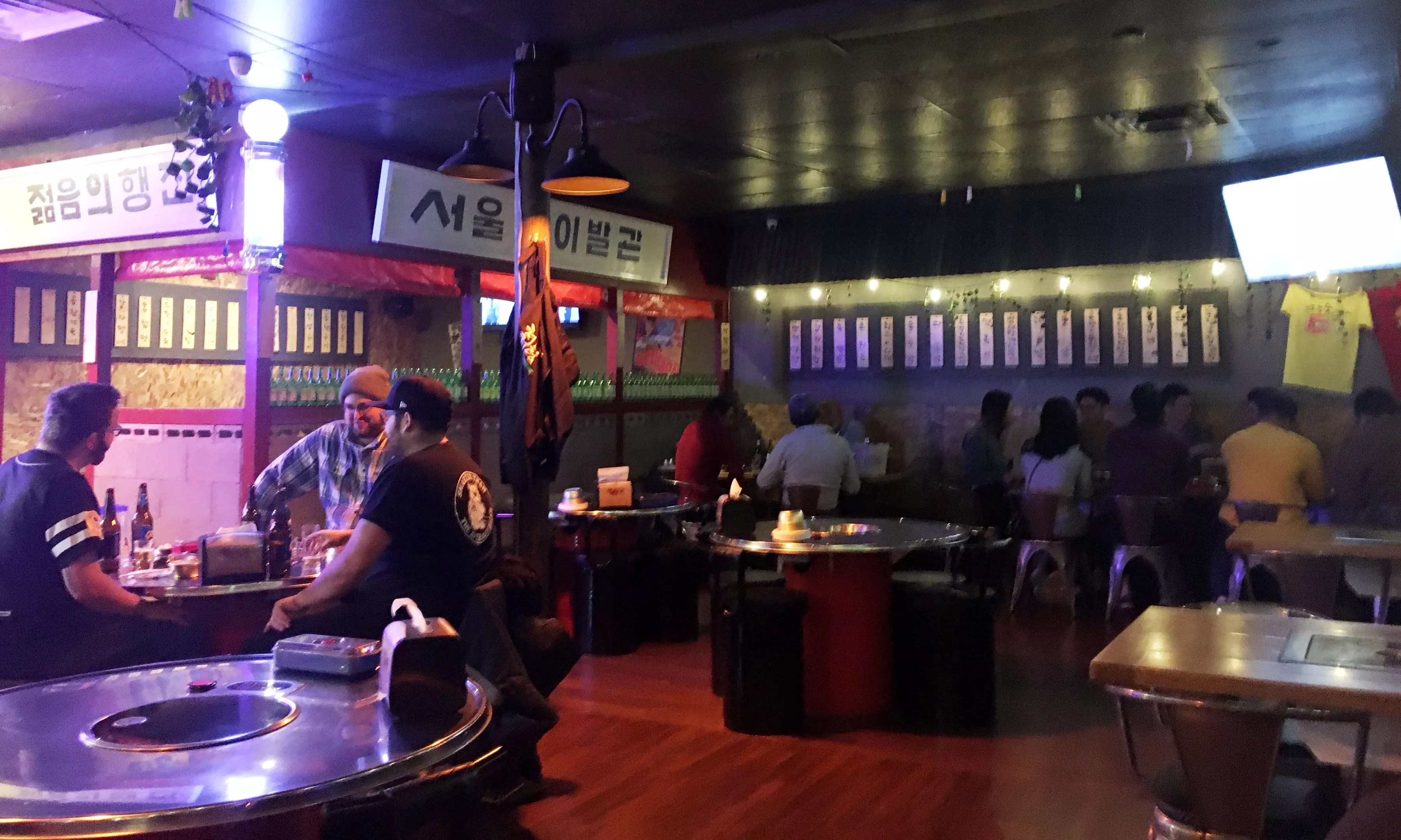 Settling in for a meal at Thank Sool Pocha is just plain fun. The place is hopping, especially during its late-night hours, when groups of all ages are focused on knocking back tiny glasses of soju and digging into dishes that range from steamed sea snails and cow-stomach barbecue to tamer picks like mix-your-own rice balls, kimchi pancakes and Korean fried chicken.