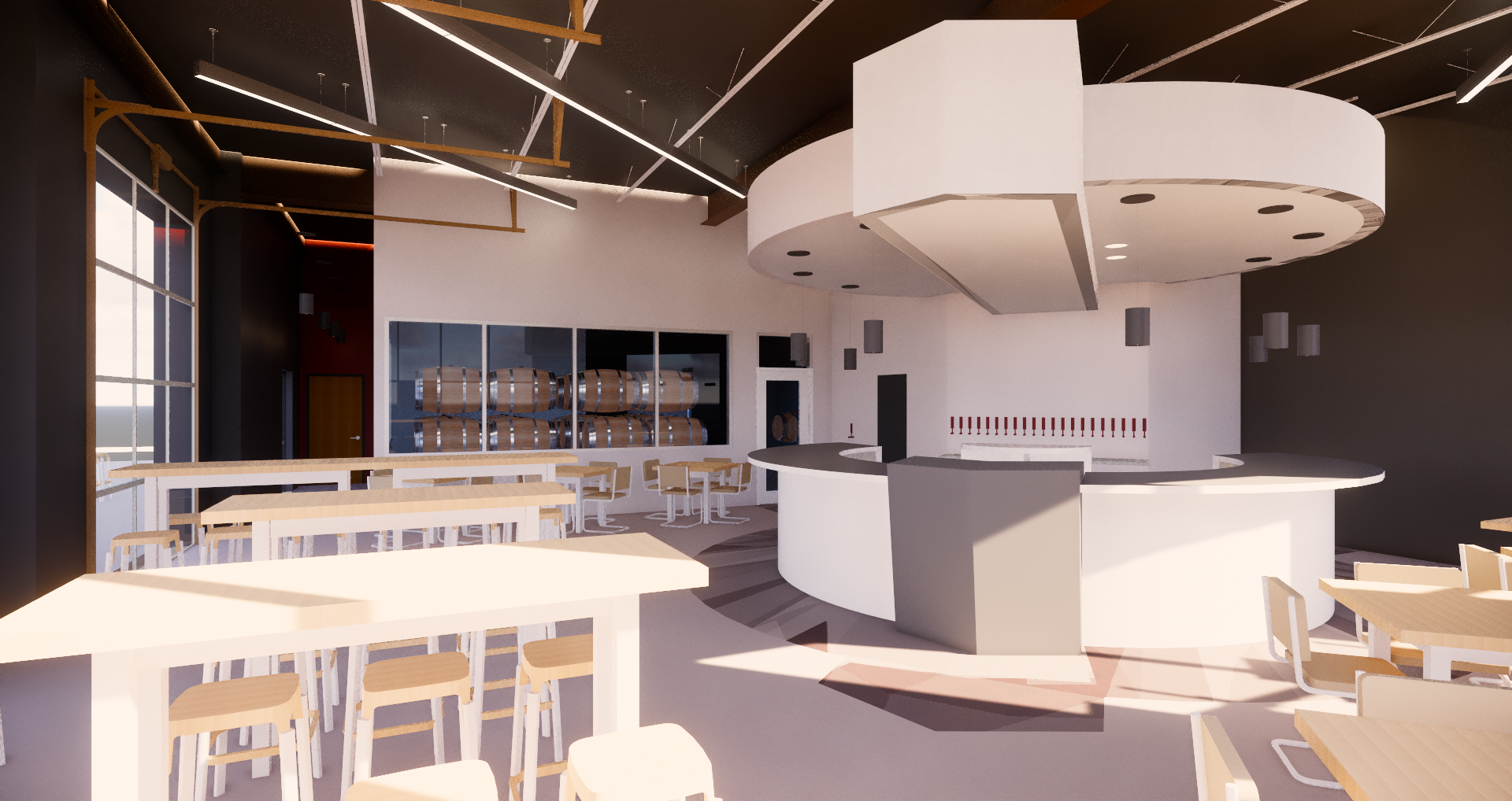 The taproom will feature a rounded bar – just like the existing brewery – and open views into a climate-controlled barrel-aging facility, a pet- and family-friendly atmosphere, and a garage door opening onto a large beer-garden patio. There will also be space for food trucks and views of the mountains to the west.