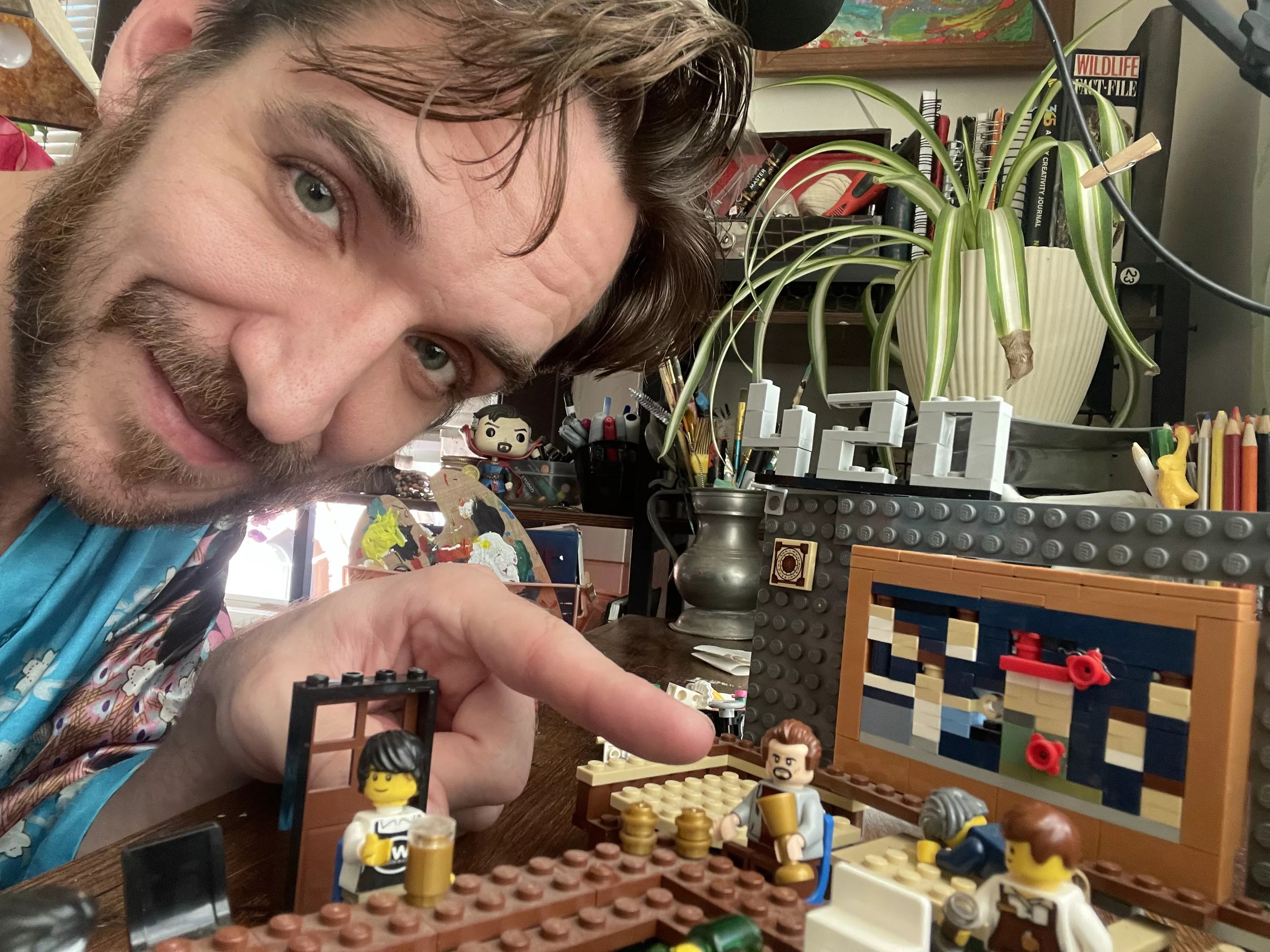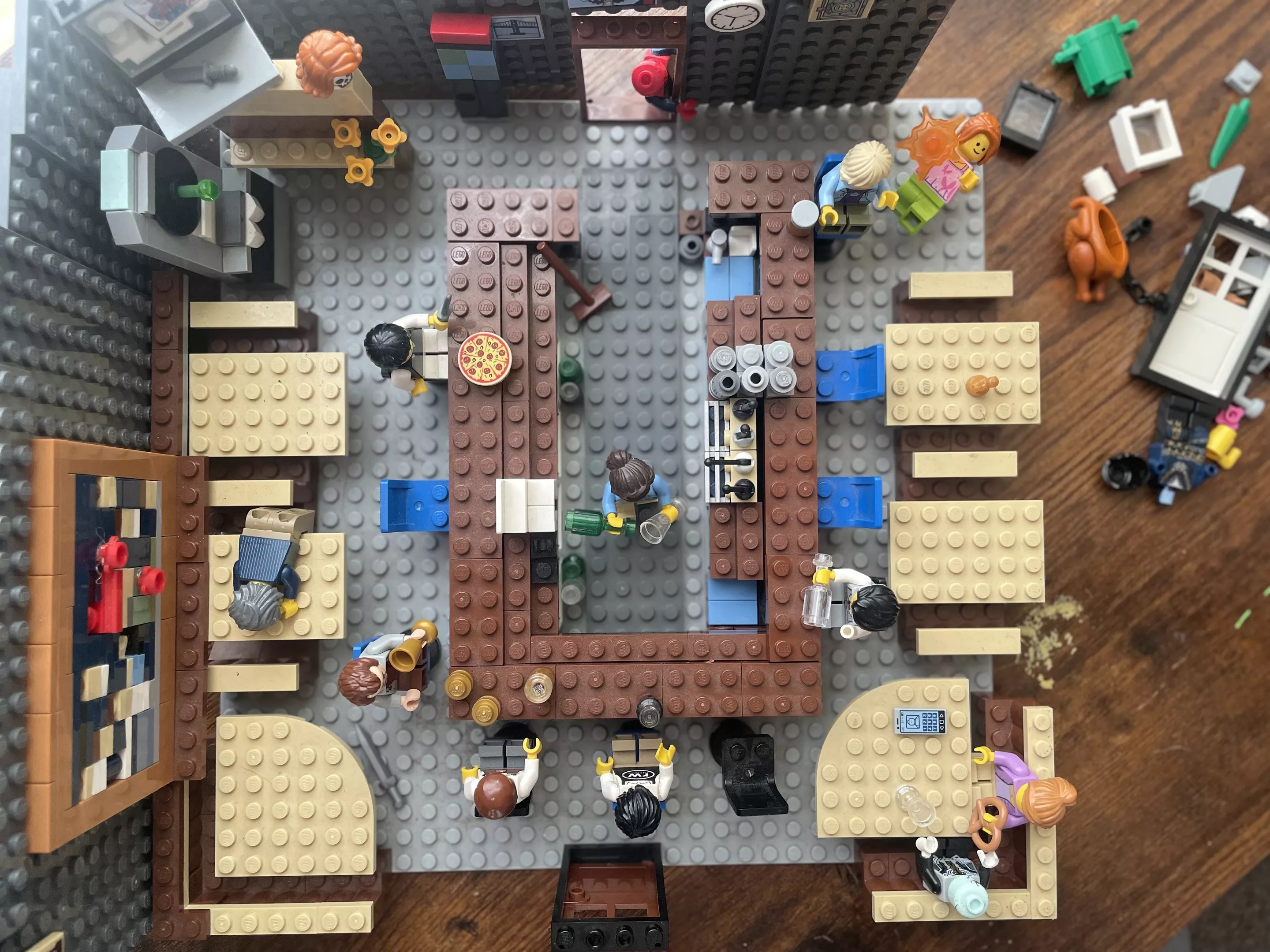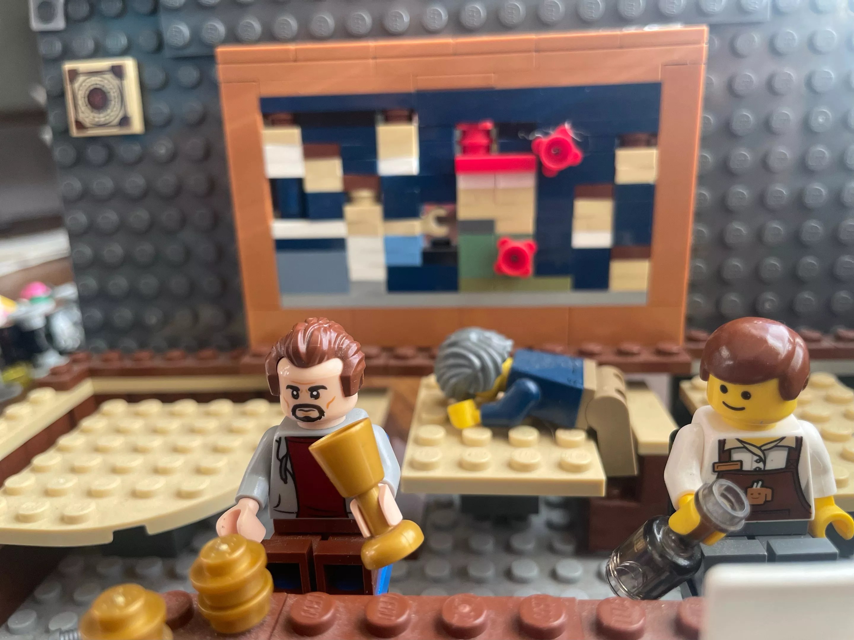 Lamb, like any artist worth his ego, inserted himself into his masterpiece. He freely admits to installing a bearded, ersatz-Zach minifigure on one of the barstools – God incognito, getting wasted with his creations.