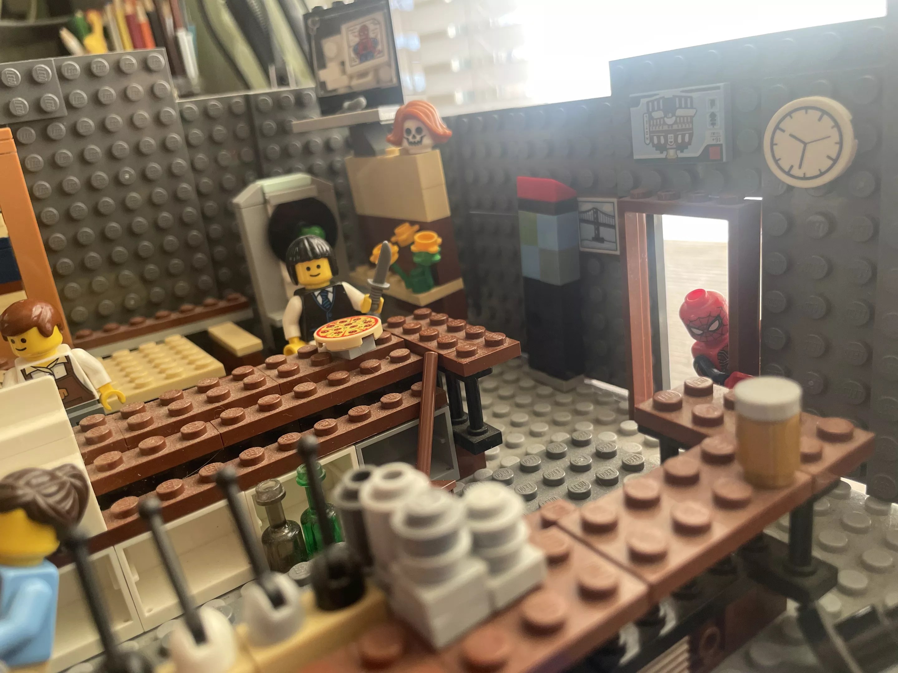 Nob Hill is nothing without its people, and likewise, LEGO Nob Hill is nothing without its LEGO people. Called “minifigures” in LEGO language, those cute, colorful homunculi populate Lamb’s diorama. Like the Last Supper as reimagined by Barney from The Simpsons, the tableau teems with patrons in the midst of guzzling, spilling, staggering, wielding knives, passing out. And peeking around the corner, there’s, um…Spider-Man? Sure, why not? Stranger beings have been seen inside those walls.