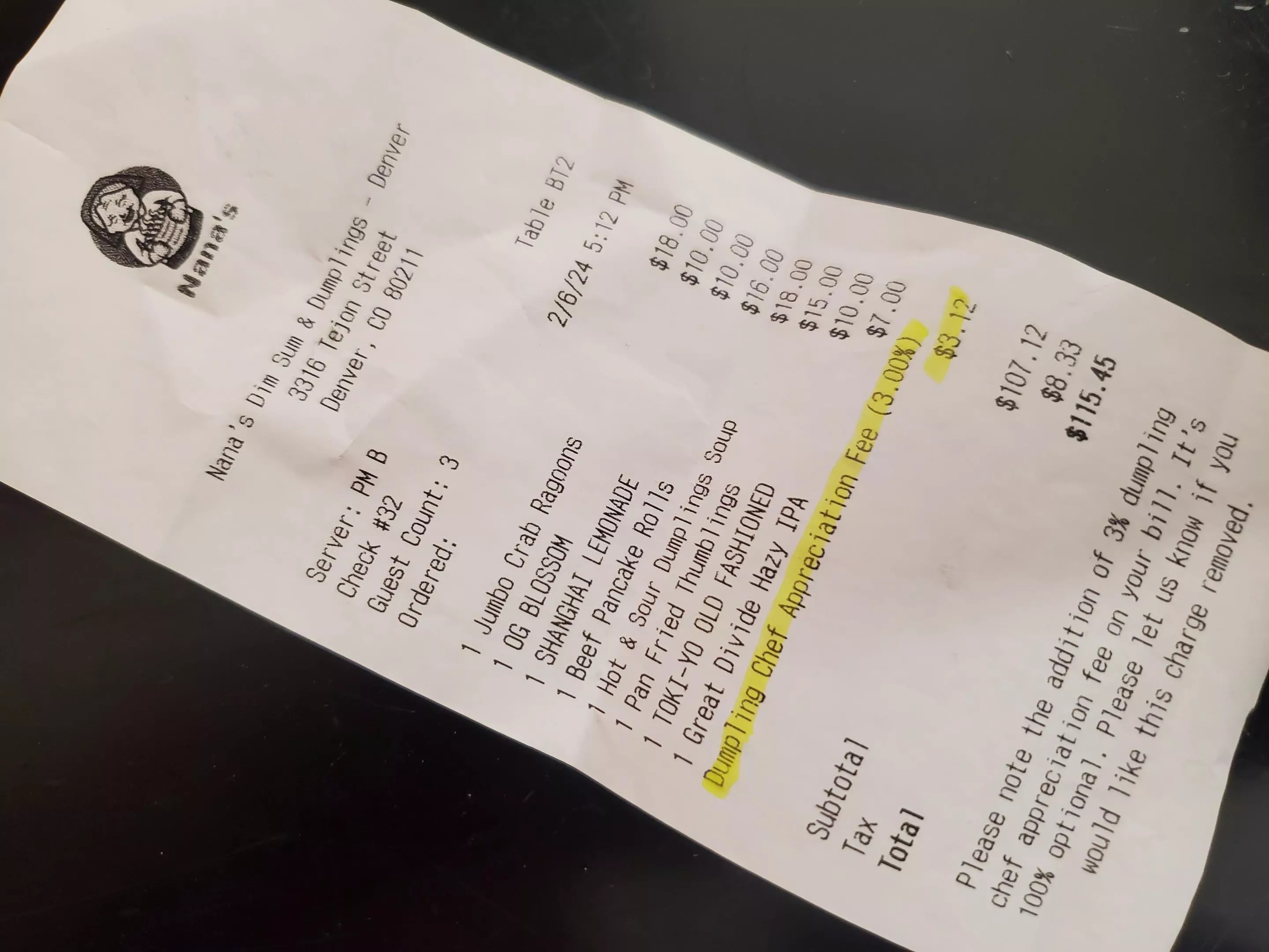 Most restaurant fees fall into three categories. Some, like Bodega’s, are a small percentage used for a specific employee benefit separate from wages. Others, like the one at Nana’s (which is optional, according to the message at the bottom of its receipt), are a small percentage that does supplement wages, usually in a way aimed at solving the equitability problem.