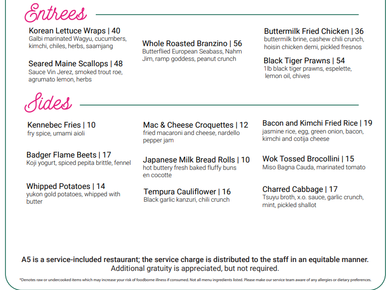 The menu at A5 notes that it is “a service-included restaurant.”