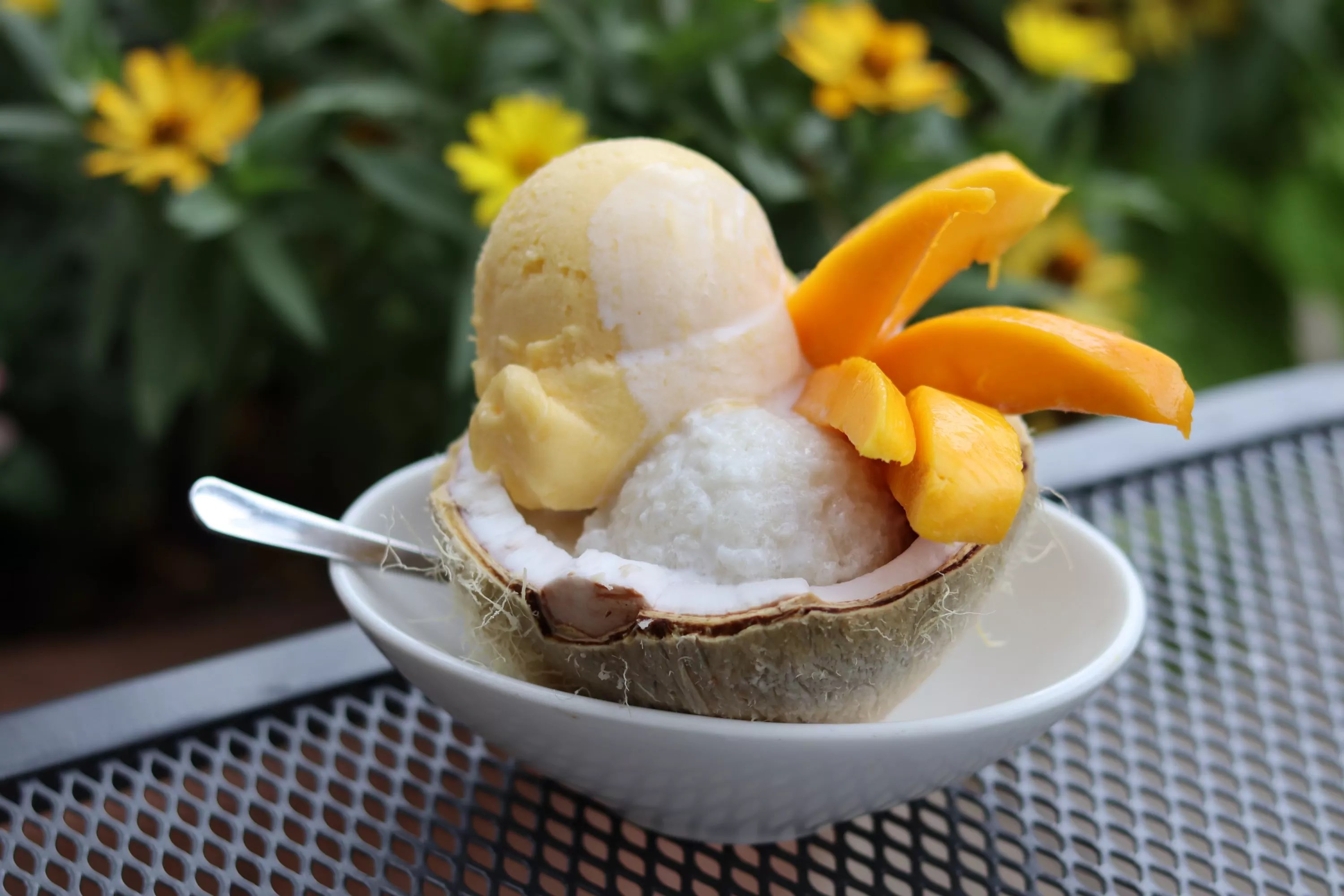 One of the most popular items on the menu is the mango sticky rice, which is served inside of a halved coconut husk. Another fan favorite is the piña colada, a pineapple smoothie base topped with pineapple coconut milk gelato and whipped cream, all presented inside of a fresh pineapple.
