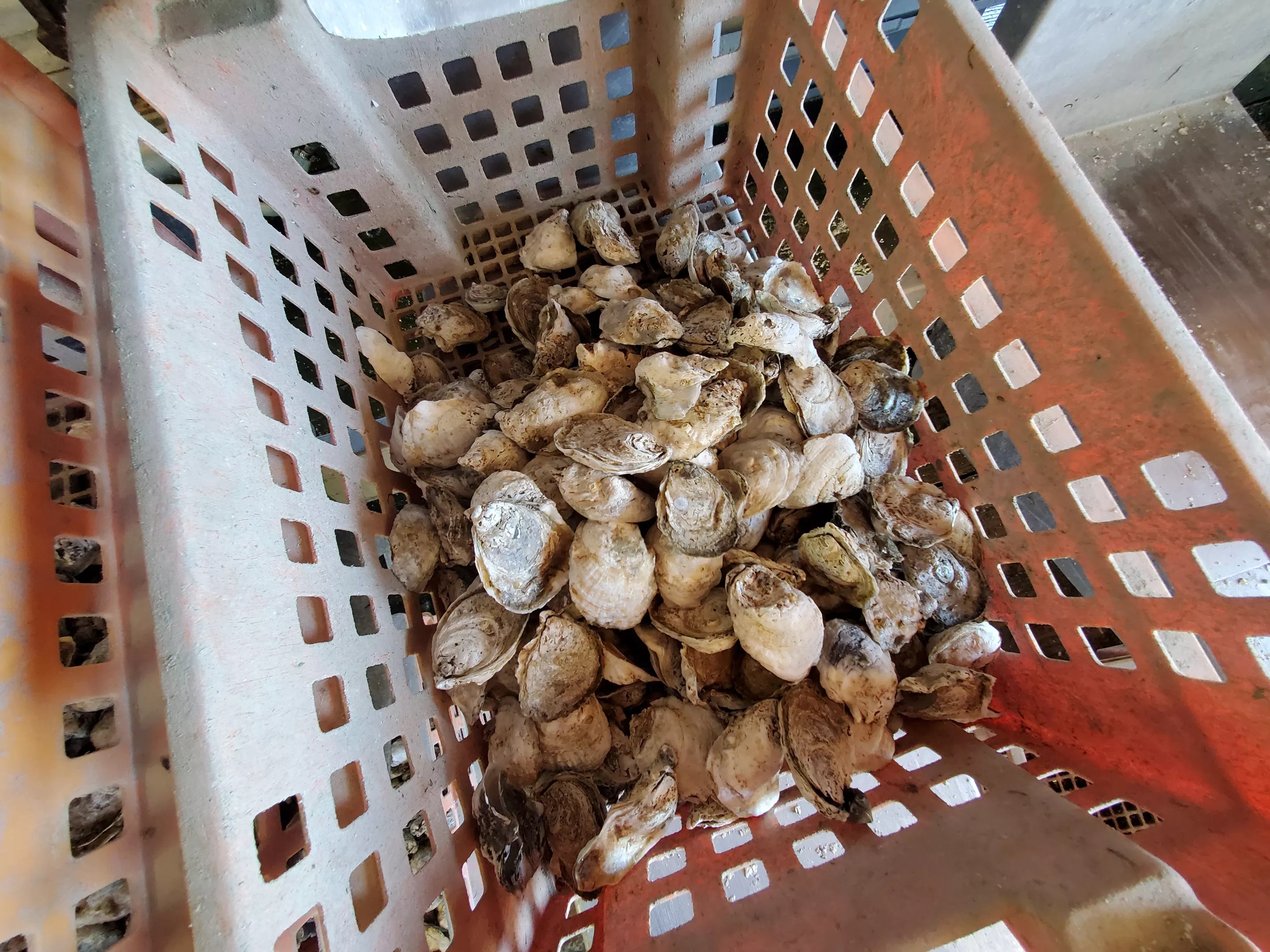 Oyster seed, or baby oysters, are kept on the dock before going out to the farm.