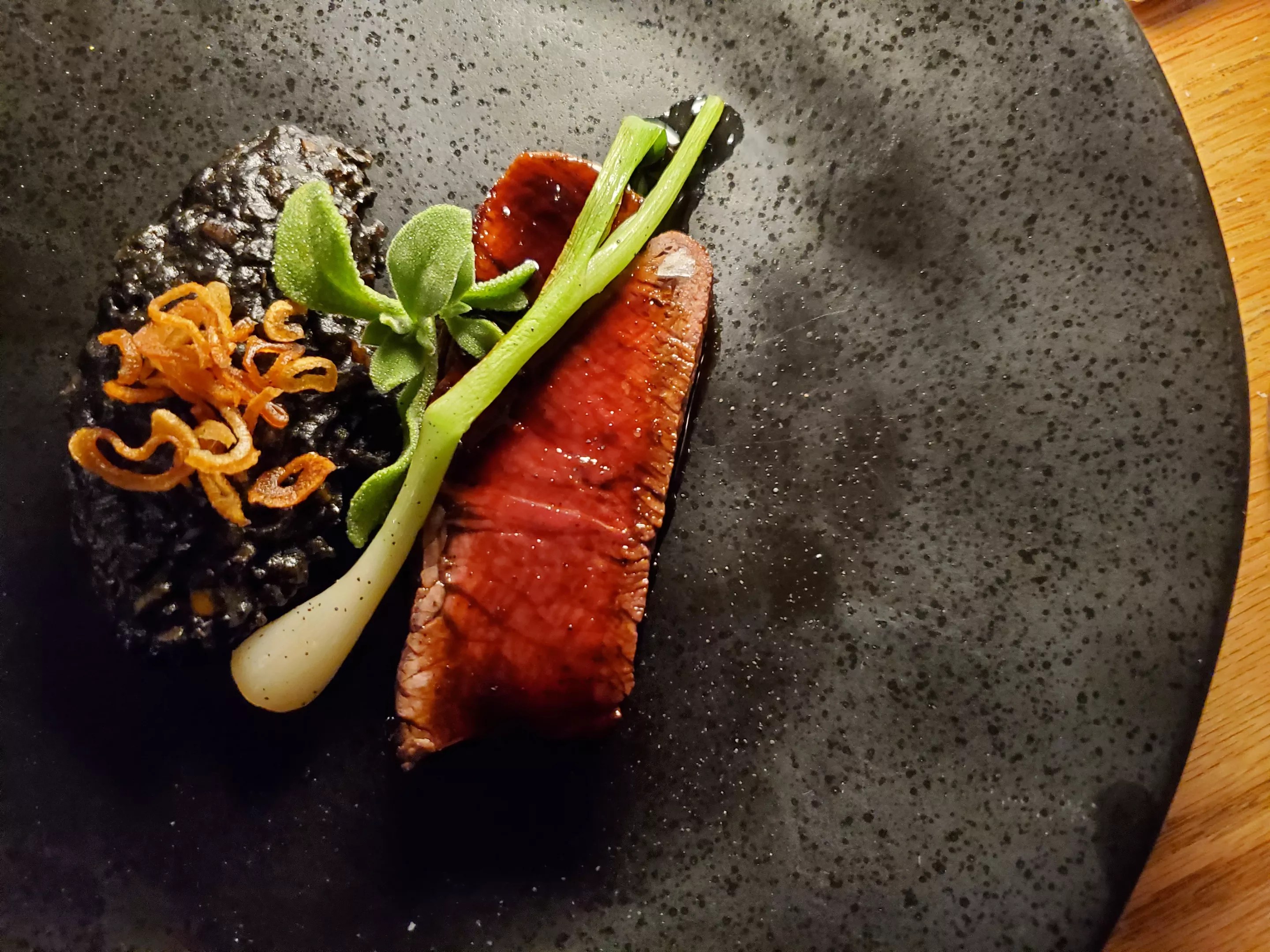 Bison tenderloin with the first ramps of the season, served with black rice.