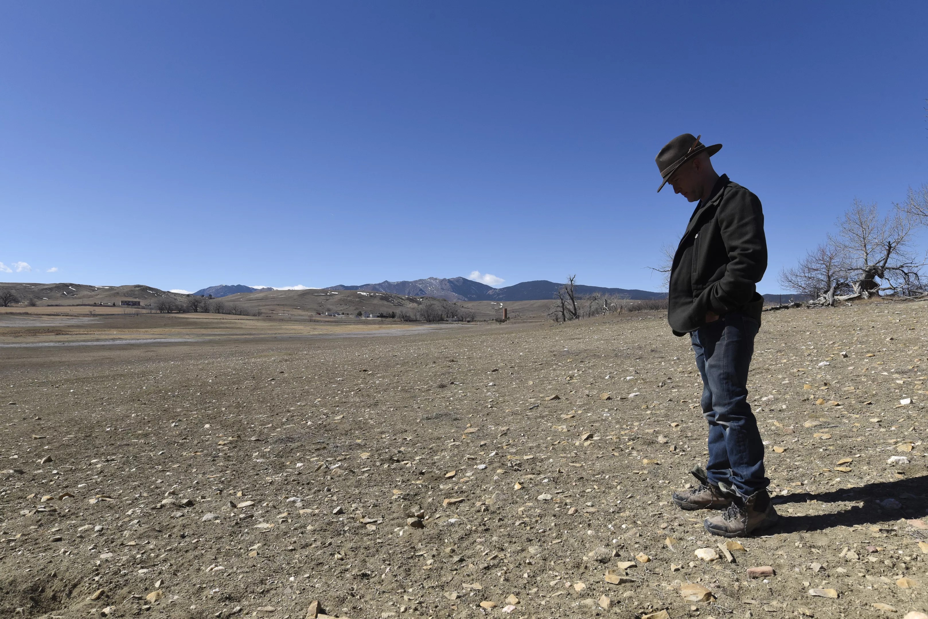 Marcus McCauley looks at the land on the neighboring property after the windstorm stripped the soil.