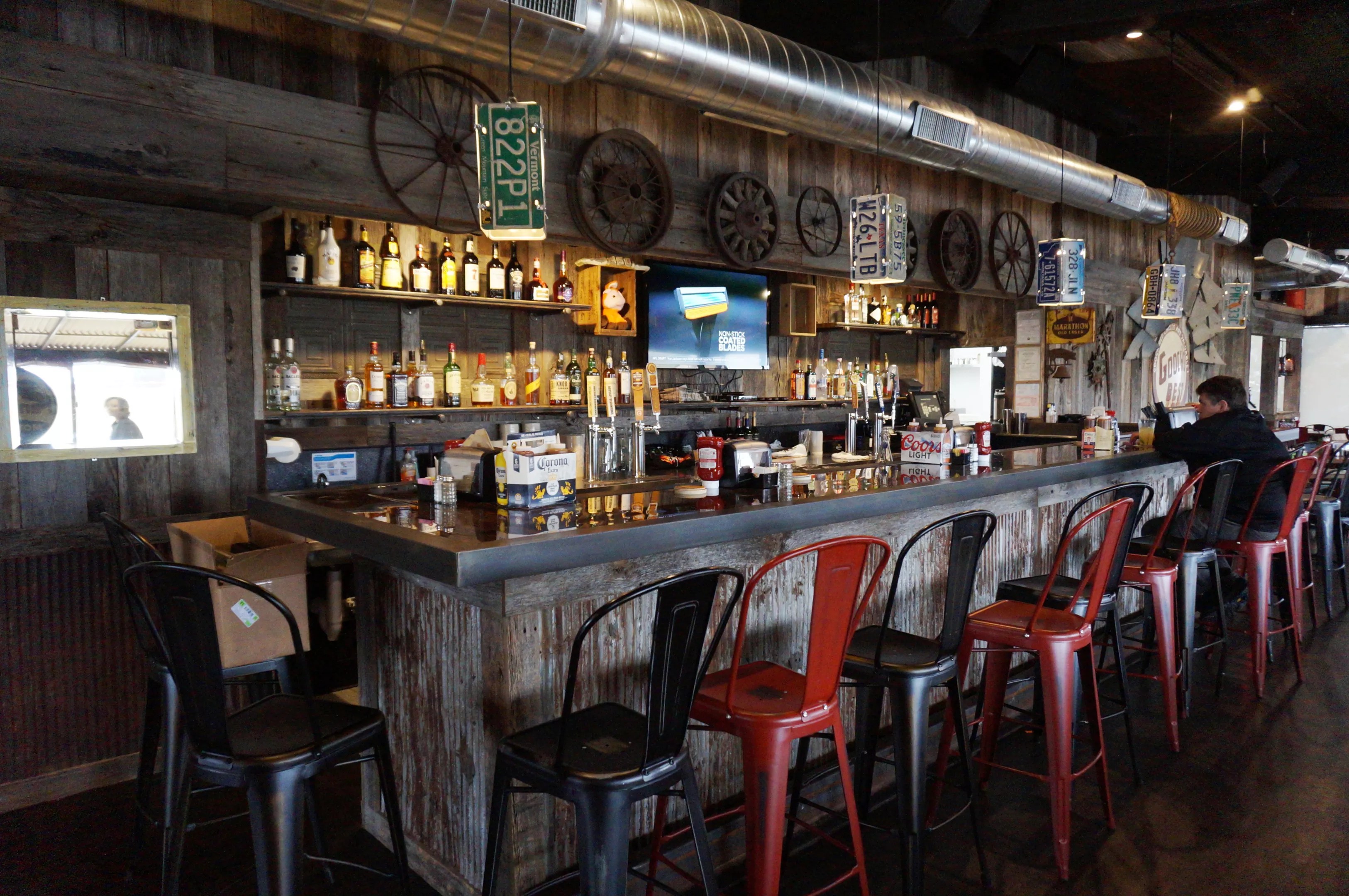 The car theme carries through the rest of the bar and restaurant, with vintage auto parts and license plates serving as decor atop barnwood paneling. The Oehlmans are both car enthusiasts and plan to host automobile rallies in the parking lot later this year.
