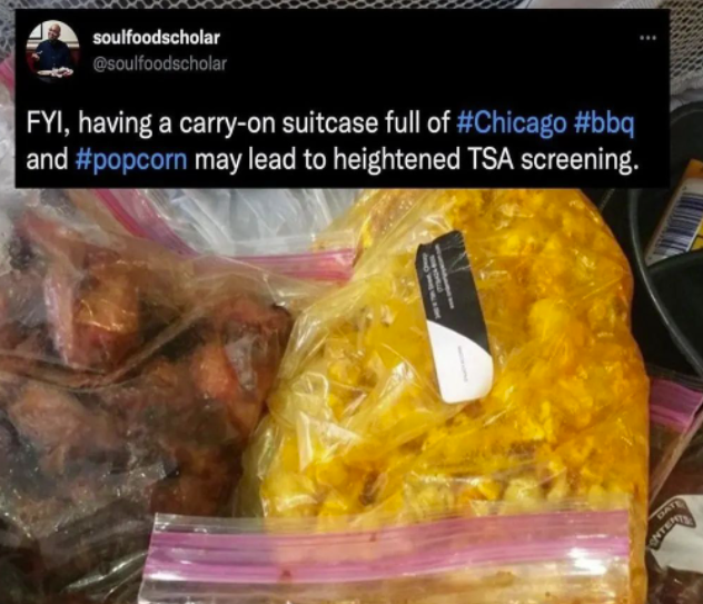 Speaking of Beard awards, Denver Soul Food Scholar Adrian Miller, who’s nominated for his book Black Smoke: African Americans and the United States of Barbecue, got an unexpected shoutout from the Transportation Security Administration when it reposted his tweet about having a carry-on full of barbecue, along with some pun-filled commentary. “Everything in this bag looks un-grill-ievable,” TSA offered. “You’ll be happy to know all this is coal by us to go in any bag. Grate job here, leaving any BBQ sauce over 3.4oz in checked bags. Let’s be frank! We know a way to keep you from getting all fired up about packing mi-steaks. Flip on over to our friends at AskTSA. Their answers are always a job well done. You’ll find them grilling online 7 days a week.”