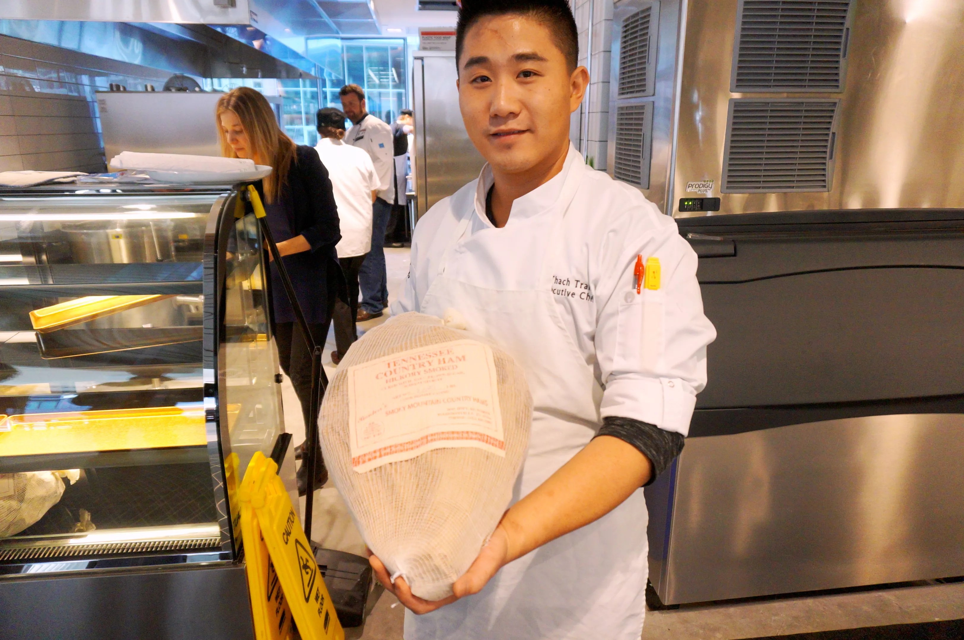 Chef Thach Tran shows off a Benton’s Tennessee country ham, which will be one of many deli items at Stella’s.