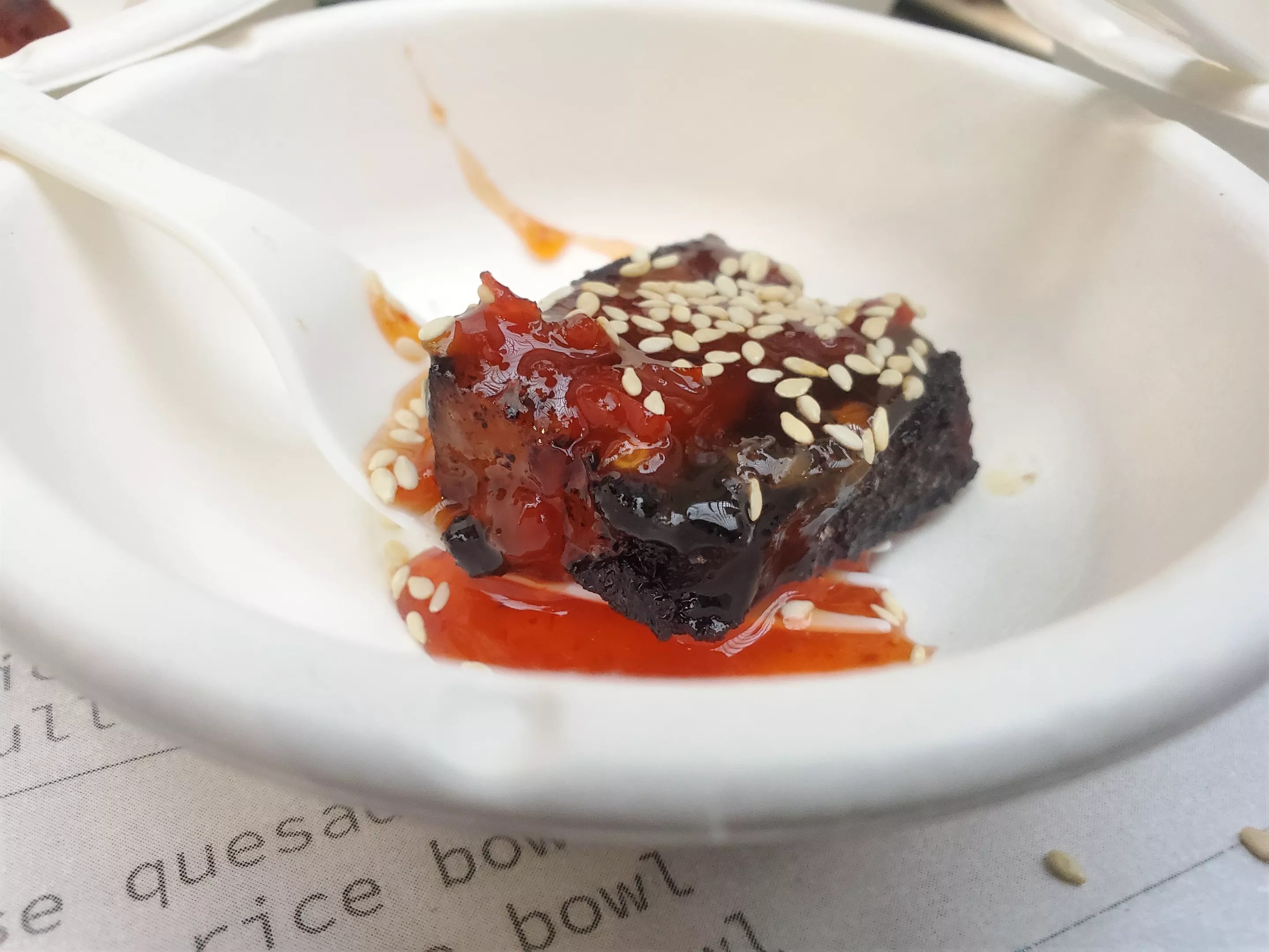 Adobo, which started as a food truck and now has locations on Federal Boulevard and inside First Draft in RiNo, is known for its smoked carnitas that can be added to its vegetarian green chile for one of the best takes on that local favorite in town. For the Big Eat, it opted for smoked pork belly instead – a single, super-tender bite amped up by the use of cherry and Thai chile glaze with some sesame seeds for crunch.