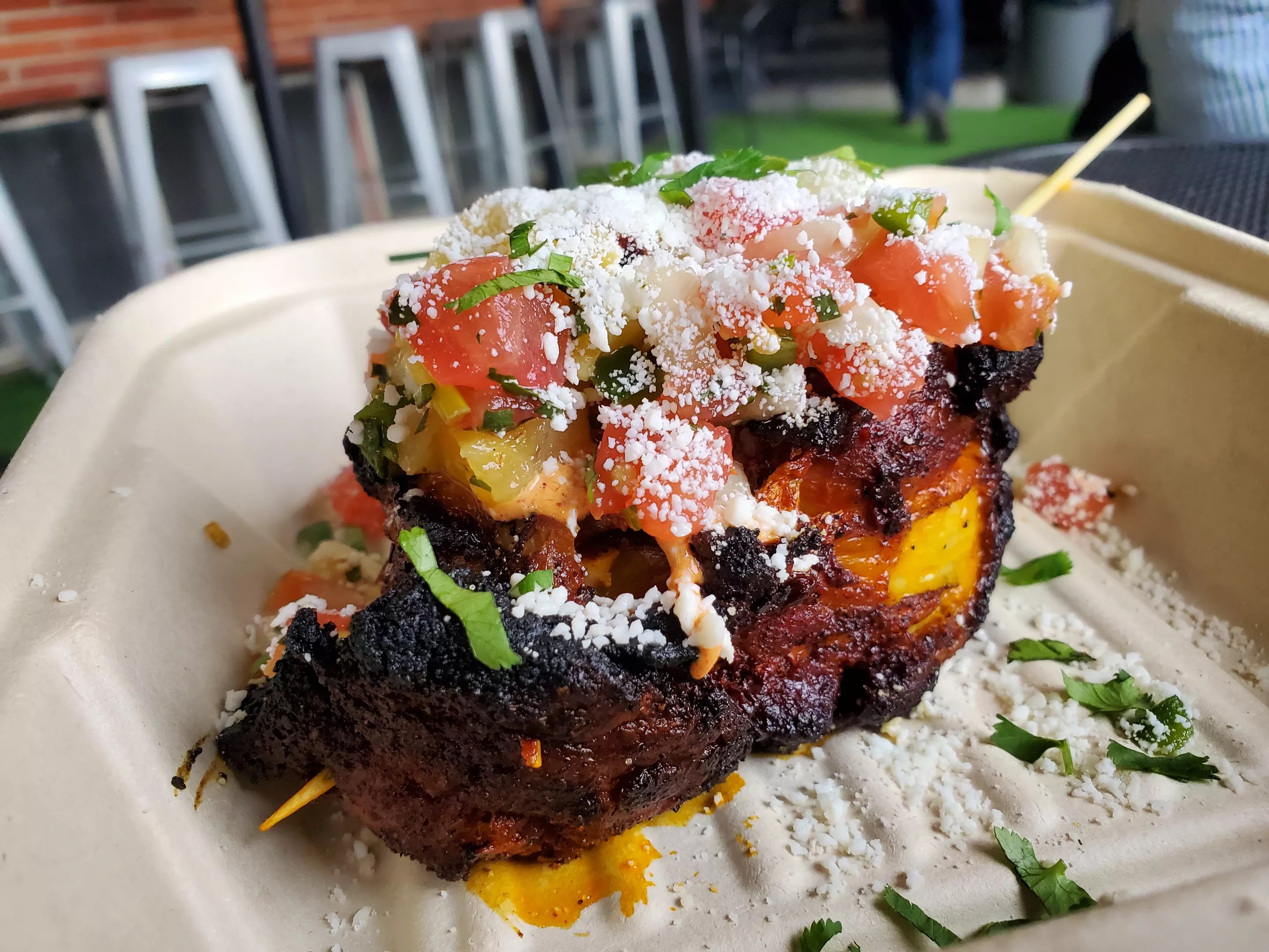 On offer are a trio of hefty porchetta sandwiches ($16 each). The Original, an homage to Paloni’s half-Italian heritage, is loaded with sliced porchetta spiced with Paloni’s signature blend as well as arugula and pink peppercorn Kewpie mayo on a rosemary foccacia roll from Boulder’s Breadworks. Paloni is also half- Hispanic, which inspired the al pastor version, for which the porchetta is marinated in an achiote rub for 24 hours, then slow-roasted, sliced and served with caramelized-pineapple pico and cotija cheese on a bolillo roll from a San Antonio bakery.
