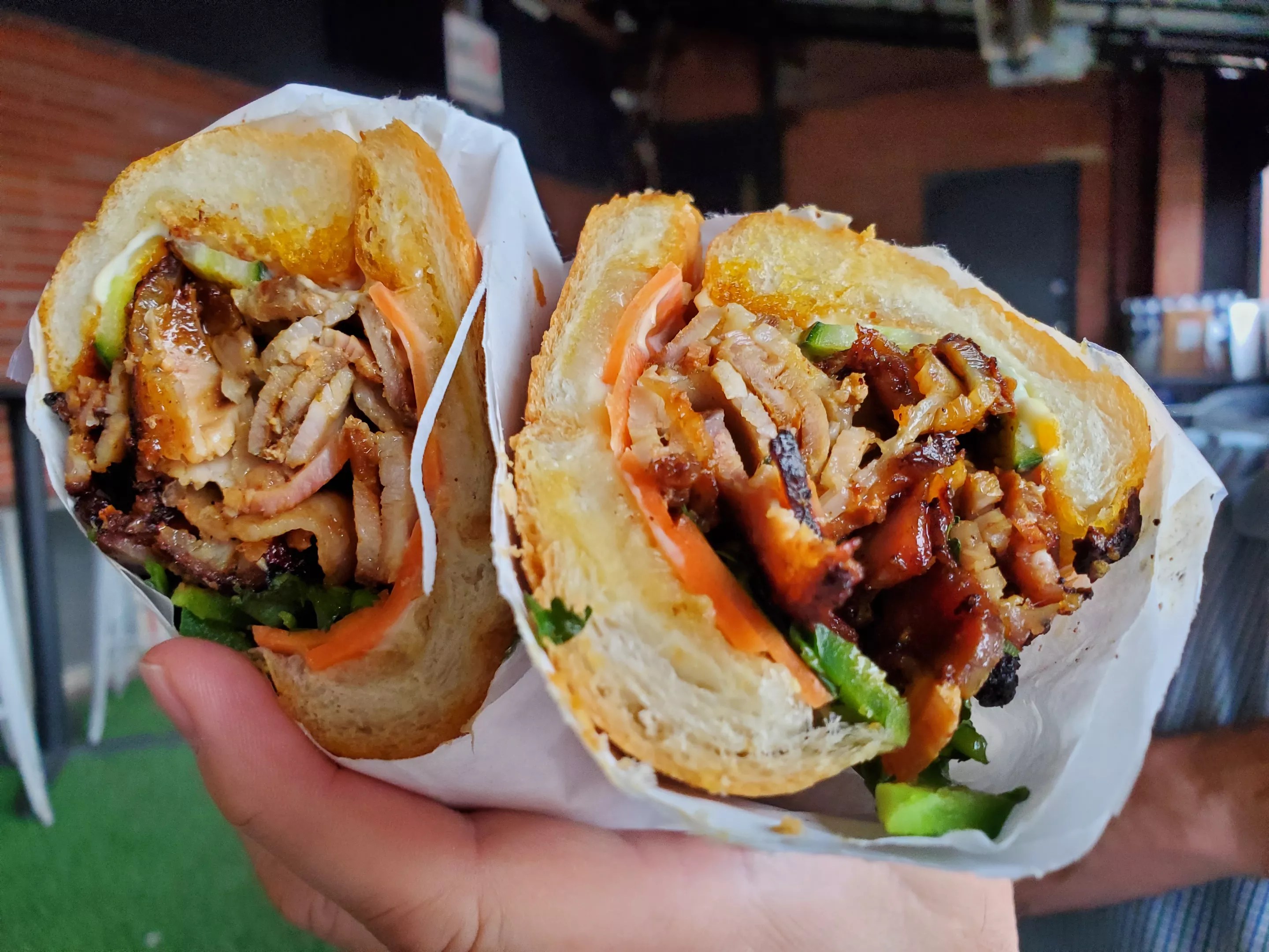 The banh mi-inspired sandwich is made with porchetta that’s marinated with red miso.