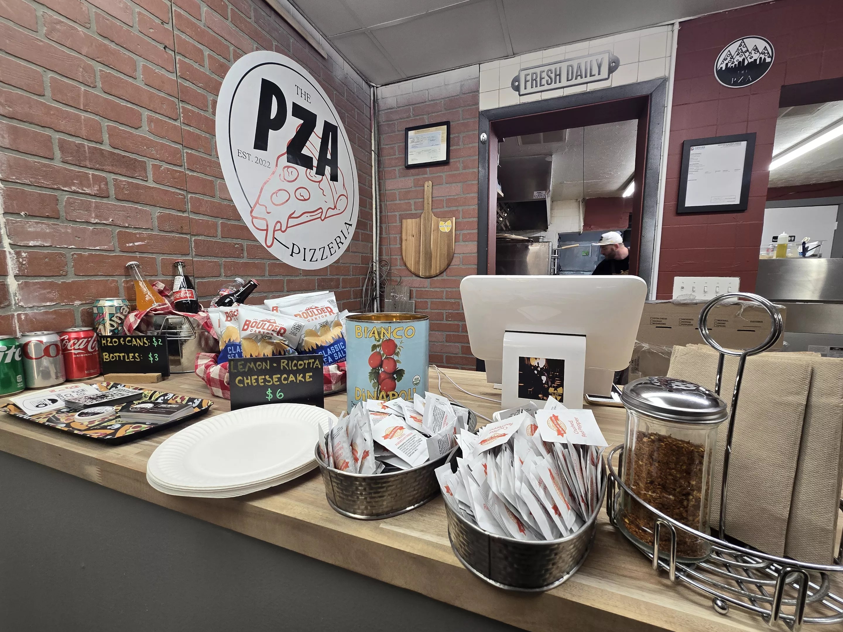 There are a few tables inside the PZA, but orders are placed at the counter.