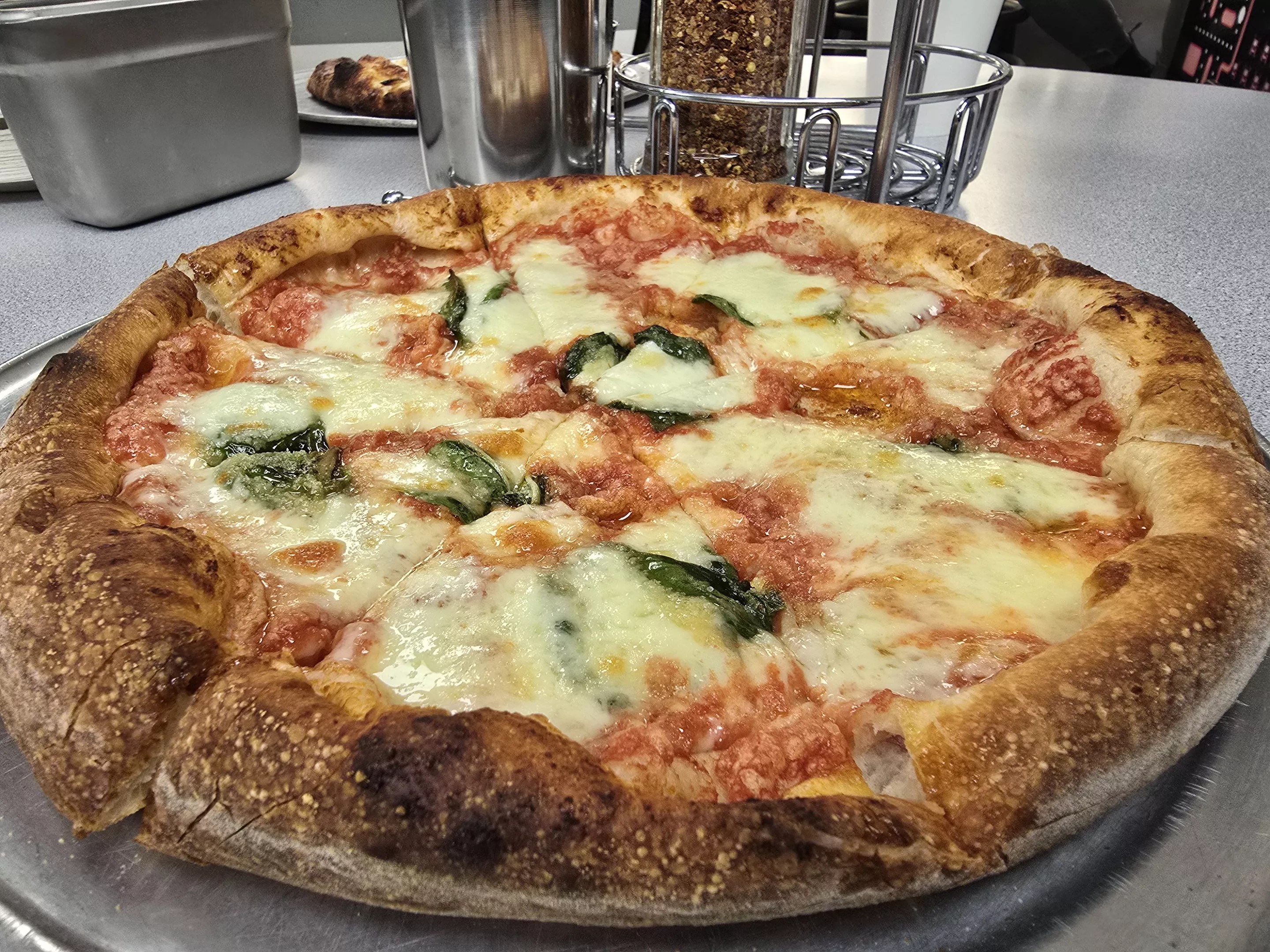 The menu includes ten pies such as the basic Cheesy-E ($14 for a regular, $22 for a large) and Margherita ($15 for a regular, $23 for a large) as well as a line of specialty pizzas priced at $17 for a regular and $26 for a large. Standouts include the Piggy Smalls, with pepperoni, bacon and chorizo; the B.I.G. Island, with bacon, jalapeño and pineapple jam instead of the typical pineapple chunks; and the Dillmatic, a pie with pickle slices and ranch that started as a special at the PZA’s previous home but proved to be so popular that it’s now a staple.
