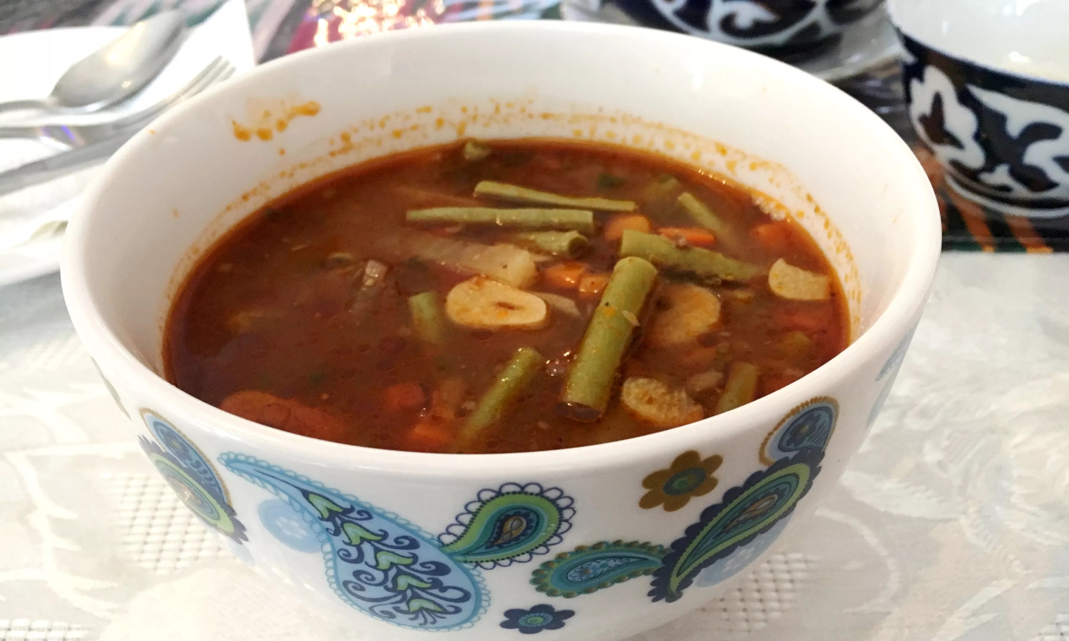 Since some menu items are not available during lunch, it’s best to go for dinner if you want to experience the full range of Uzbekistan’s diverse cultural influences. Lagman is one of the country’s most celebrated dishes, a noodle soup brought to the country from western China by Uyghur migrants. Some preparations of lagman are almost ramen-like in appearance, with a red slick of chile oil on top and a pile of stewed lamb forming an island in the center, but Samarkand’s version is more rustic and homey.