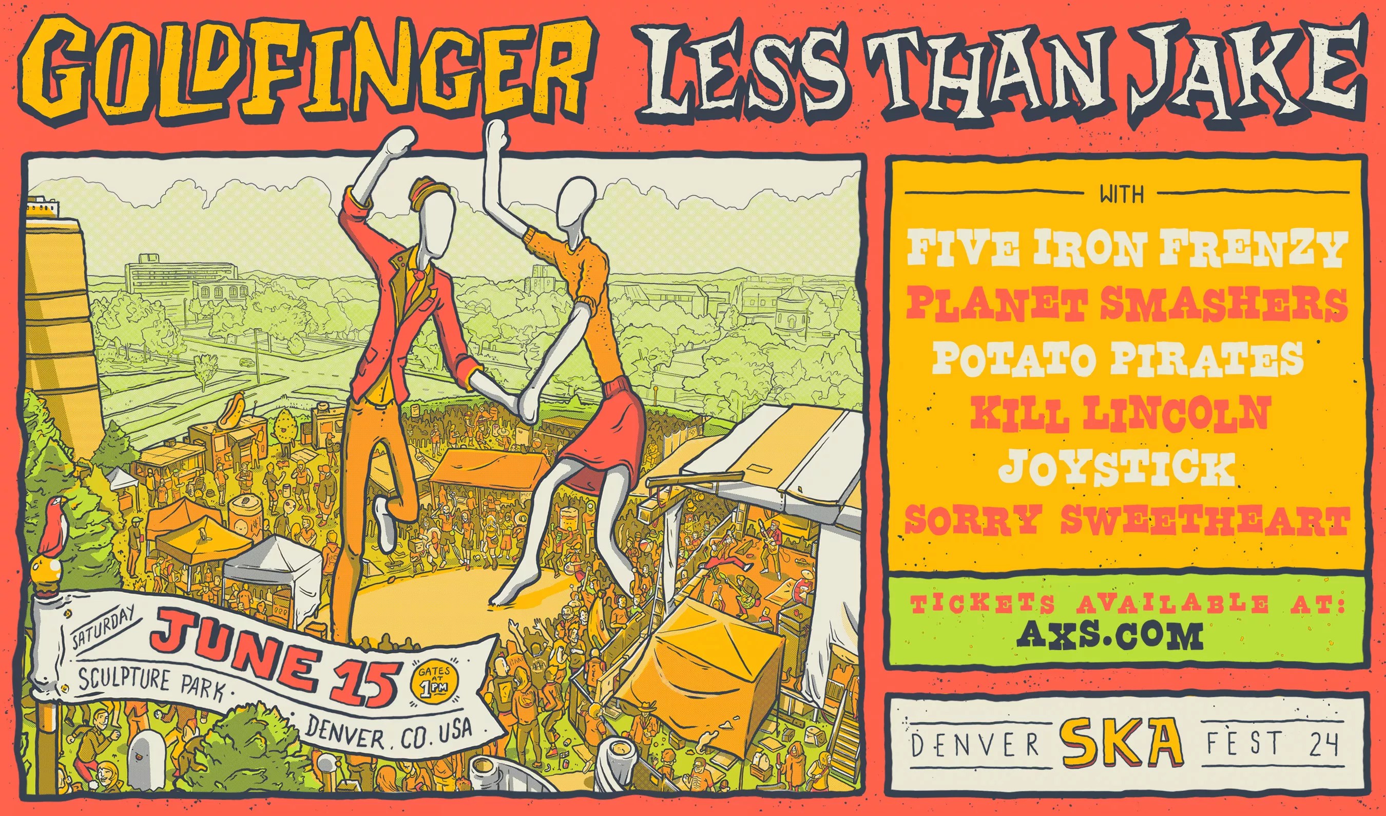 Denver Ska Fest – an all-ages celebration of the music – will feature headliners Los Angeles-based Goldfinger and Less Than Jake, which started in Gainesville, Florida. Also on the bill will be The Planet Smashers from Montreal, Kill Lincoln of Washington, D.C., and Joystick! From New Orleans, as well as a trio of Denver ska bands: Five Iron Frenzy, Sorry Sweetheart, and The Potato Pirates.