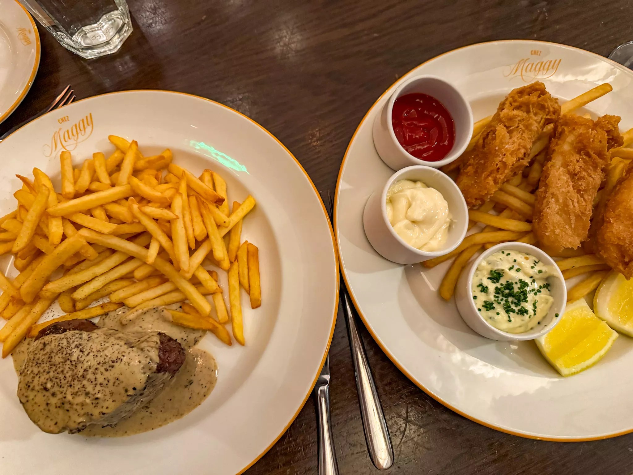 We ordered the fish and chips and the filet aux poivre, an eight-ounce beef tenderloin, for dinner. Both were incredible, and anyone who says you can’t get delicious seafood in Denver hasn’t had the fish and chips at Chez Maggy.