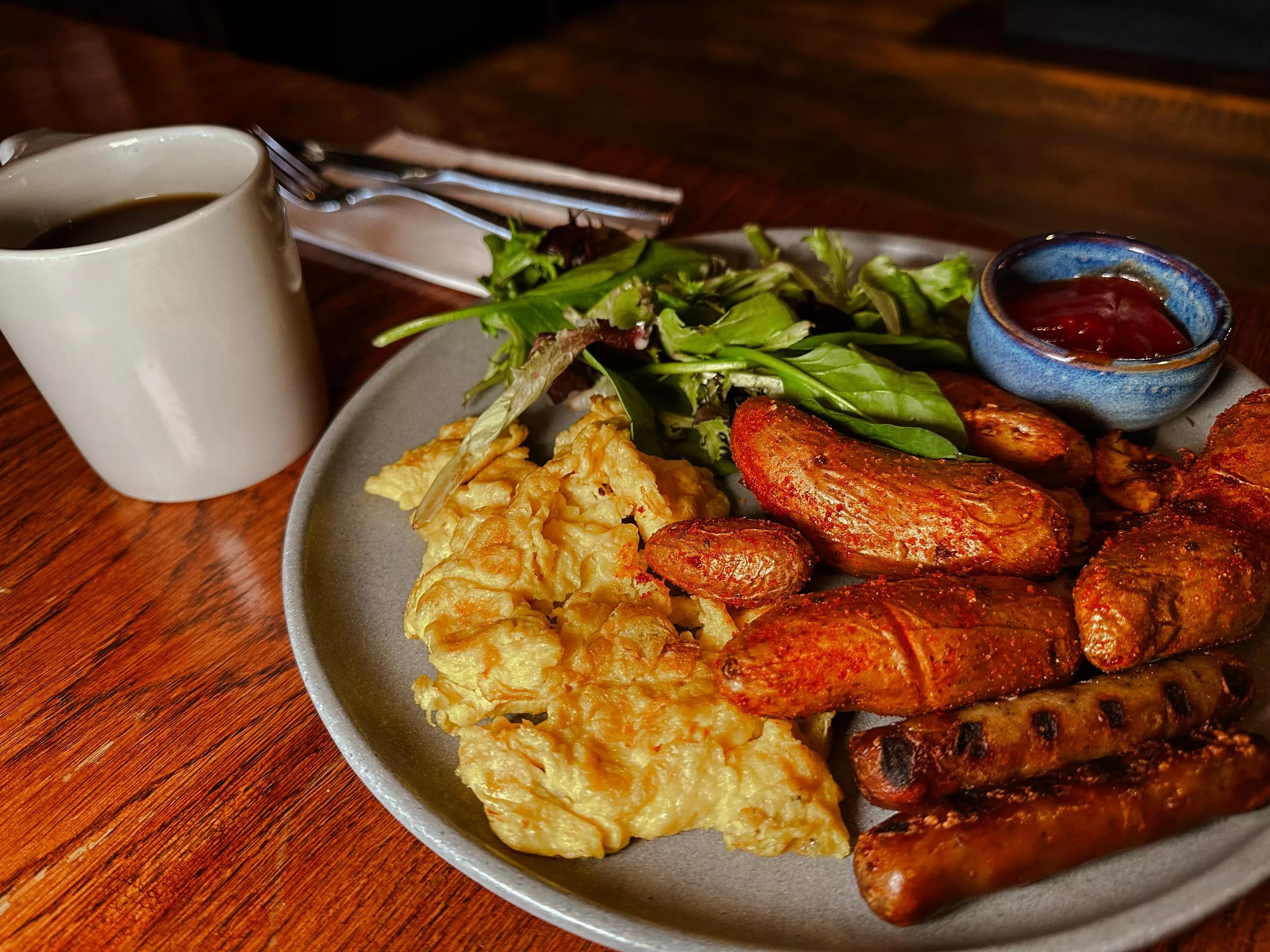 The drip coffee Unravel had available was Finca San Antonio. Like all sixteen of its roasts, this one is small-batch and sustainably sourced from Ethiopia, with each sip brimming with notes of wine grapes, pastry and spice. For breakfast, I ordered the Haus breakfast, complete with eggs, haus potatoes and sausage.